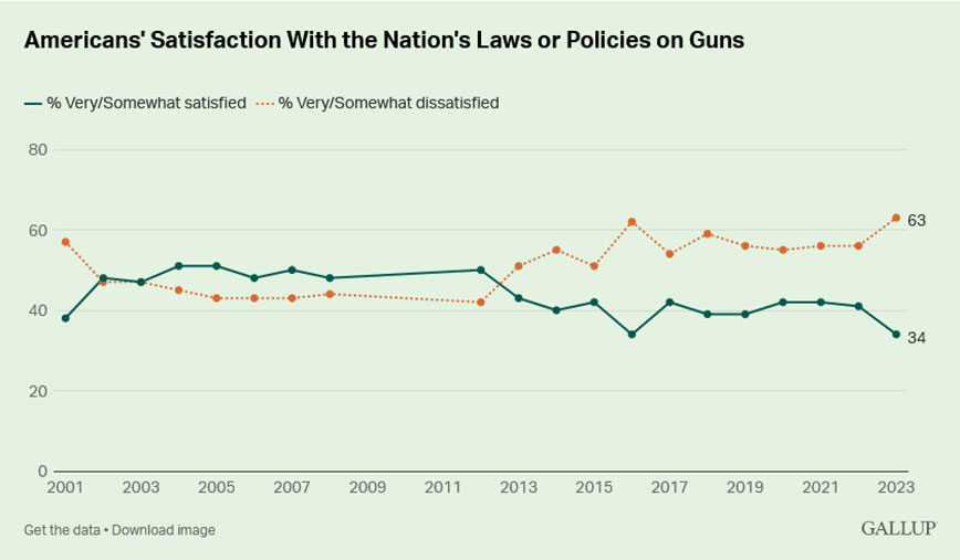 Πρόσφατη έρευνα του Ινστιτούτου Gallup έδειξε ότι το 63% των Αμερικανών δεν είναι ικανοποιημένο με τη νομοθεσία περί όπλων, με το 54% των Ρεπουμπλικάνων να δηλώνει ικανοποίηση έναντι του 14% των Δημοκρατικών.