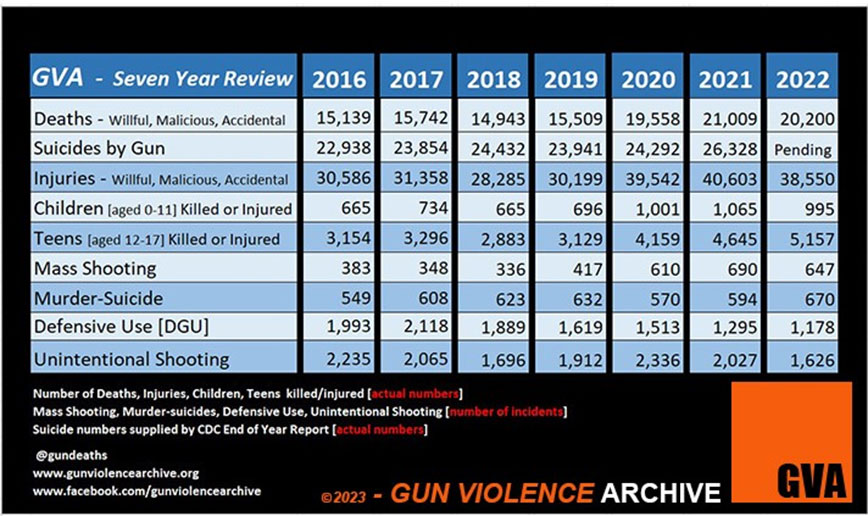 Σύμφωνα με το Gun Violence Archive (Αρχείο Ενοπλης Βίας), από την αρχή του 2023 έχουν σημειωθεί στις ΗΠΑ περισσότερα από 566 περιστατικά μαζικών πυροβολισμών, ενώ ο μέχρι στιγμής συνολικός αριθμός των νεκρών από πυροβόλα όπλα ξεπερνάει τις 35.000. Ως περιστατικό μαζικού πυροβολισμού λογίζεται εκείνο το συμβάν κατά τη διάρκεια του οποίου σκοτώνονται ή τραυματίζονται τουλάχιστον τέσσερις άνθρωποι. Τα τελευταία – αρκετά – χρόνια, στις ΗΠΑ, κατά μέσο όρο λαμβάνουν χώρα δύο μαζικοί πυροβολισμοί την ημέρα, δηλαδή περισσότεροι από 600 το χρόνο. Η φονικότερη επίθεση καταγράφηκε στο Λας Βέγκας το 2017, με περισσότερους από 50 νεκρούς και 500 τραυματίες.