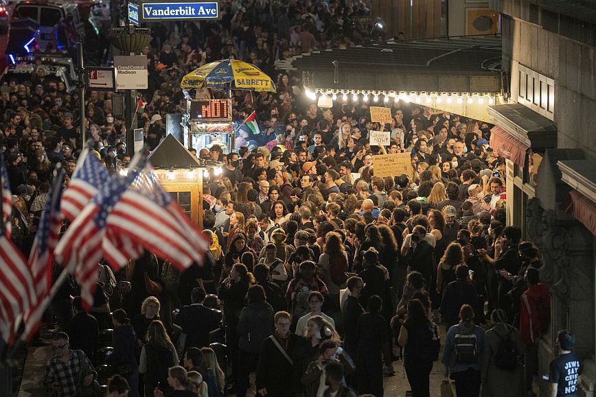 Εικόνες δείχνουν τον σταθμό γεμάτο με διαδηλωτές που κρατούν πανό, πάνω στα οποία αναγράφεται: «Οι Παλαιστίνιοι πρέπει να είναι ελεύθεροι» και «Θρηνείτε τους νεκρούς, αγωνιστείτε σαν τον διάβολο για τους ζωντανούς».