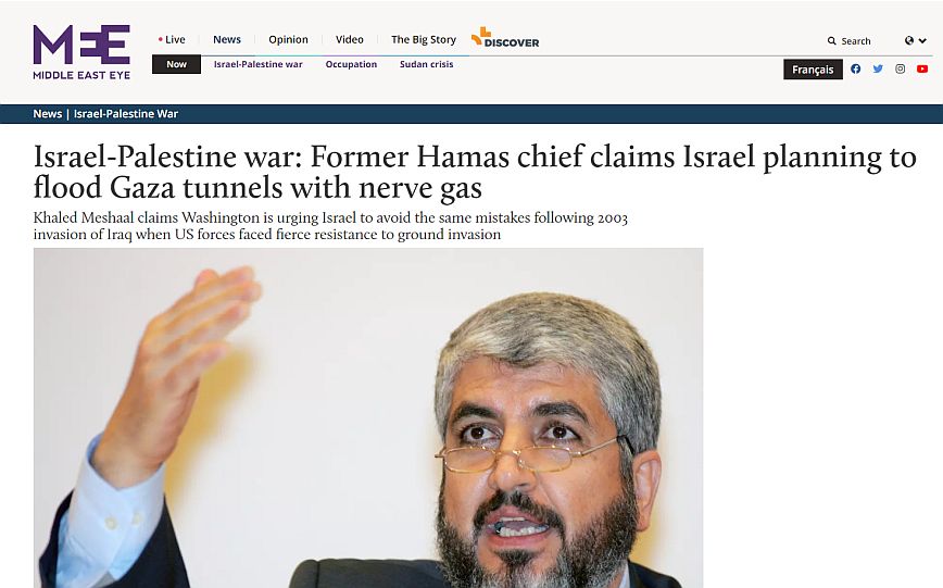 O πρώην επικεφαλής της Χαμάς, Χαλέντ Μεσάαλ, καταγγέλλει ότι το Ισραήλ σχεδιάζει να πλημμυρίσει τις σήραγγες της Χαμάς με ένα είδος νευροπαραλυτικού αερίου ή χημικού όπλου.