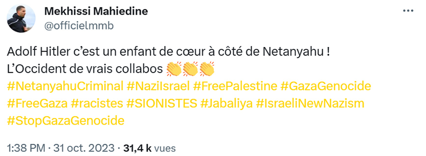 Ο Γάλλος Μαχιεντίν Μεκχισί, τρεις φορές Ολυμπιονίκης, συνέκρινε τον Ισραηλινό πρωθυπουργό Μπέντζαμιν Νετανιάχου με τον Αδόλφο Χίτλερ, προκαλώντας την οργή των συμπολιτών του. «Ο Αδόλφος Χίτλερ είναι σχολιαρόπαιδο μπροστά στον Νετανιάχου! Οι ηγέτες της Δύσης είναι πραγματικοί συνεργάτες του», έγραψε στο Χ ο Γάλλος αθλητής συνοδεύοντας το μήνυμά του με τα hashtags, #Nazisrael #GazaGenocide και #IsraeliNewNazism.