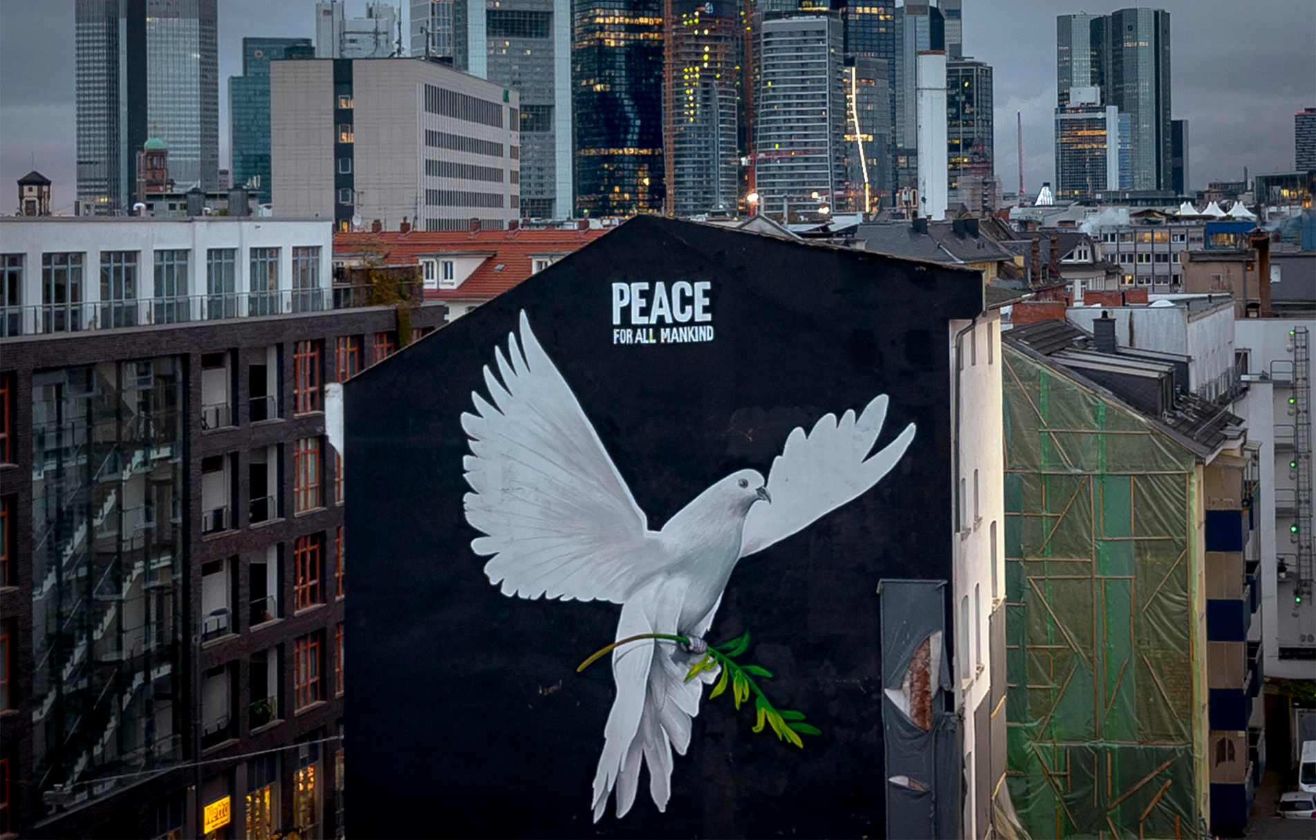Με τους σοβαρούς πολέμους, ανάμεσα σε Ρωσία – Ουκρανία και Ισραήλ – Παλαιστίνη, να είναι αυτή τη στιγμή σε εξέλιξη, η κατάσταση στον κόσμο είναι τραγική. Στη Φρανκφούρτη της Γερμανίας, ο καλλιτέχνης Justus Becker ζωγράφισε μια τοιχογραφία για την ειρήνη, που δείχνει ένα λευκό περιστέρι να κρατά ένα κλαδί ελιάς. Όταν είχε ξεκινήσει ο πόλεμος στην Ουκρανία, στην τοιχογραφία φαινόταν ένα κλαδί σε ουκρανικά χρώματα. Τώρα άλλαξε και έχει γράμματα που γράφουν «Ειρήνη για όλη την ανθρωπότητα».