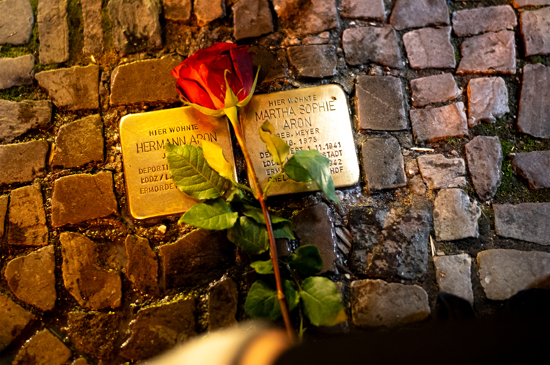 Ένα τριαντάφυλλο τοποθετείται κοντά σε ένα «Stolpersteine», στη μνήμη των ανθρώπων, οι περισσότεροι από τους οποίους ήταν Εβραίοι, που εκτοπίστηκαν και σκοτώθηκαν από τους Ναζί, την παραμονή της 85ης επετείου του αντιεβραϊκού πογκρόμ των Ναζί το 1938, στο Βερολίνο της Γερμανίας. Χιλιάδες πέτρες έχουν τοποθετηθεί σε πεζοδρόμια μπροστά από σπίτια στη Γερμανία και σε άλλες ευρωπαϊκές χώρες, όπου έζησαν ή εργάστηκαν θύματα των Ναζί πριν απελαθούν και δολοφονηθούν. Οι επιγραφές περιλαμβάνουν τα ονόματα των θυμάτων, τις ημερομηνίες της γέννησής τους, της απέλασης και δολοφονίας τους. Οι πέτρες καθαρίζονται από τους κατοίκους κατά την επέτειο της 9ης Νοεμβρίου, για να τιμήσουν τη μνήμη των θυμάτων της ναζιστικής Γερμανίας.