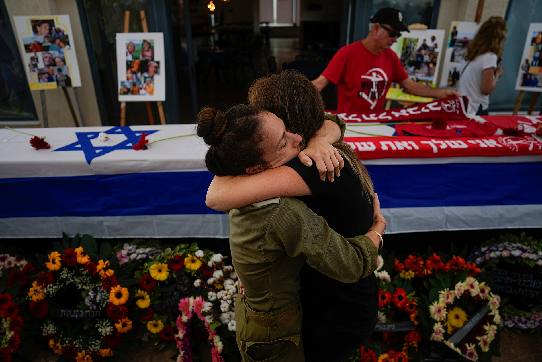 Άνθρωποι αγκαλιάζονται κατά τη διάρκεια της κηδείας των Meni και Ayelet Godard. Το ισραηλινό ζευγάρι σκοτώθηκε από μαχητές της Χαμάς στις 7 Οκτωβρίου, στο κιμπούτς Be’eri, κοντά στα σύνορα με τη Λωρίδα της Γάζας. Περισσότεροι από 1.400 άνθρωποι σκοτώθηκαν και περίπου 220 αιχμαλωτίστηκαν σε μια άνευ προηγουμένου πολυμέτωπη επίθεση κατά του Ισραήλ.