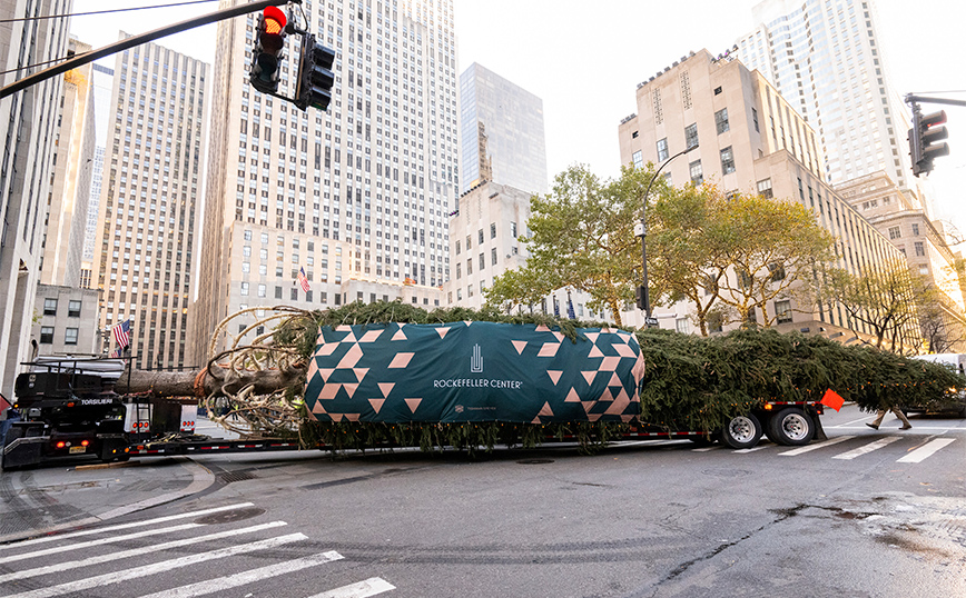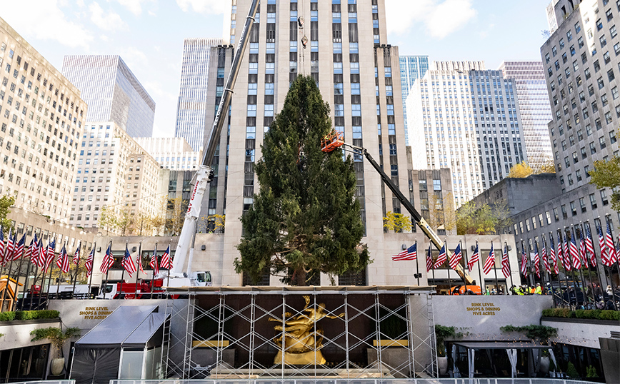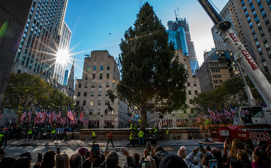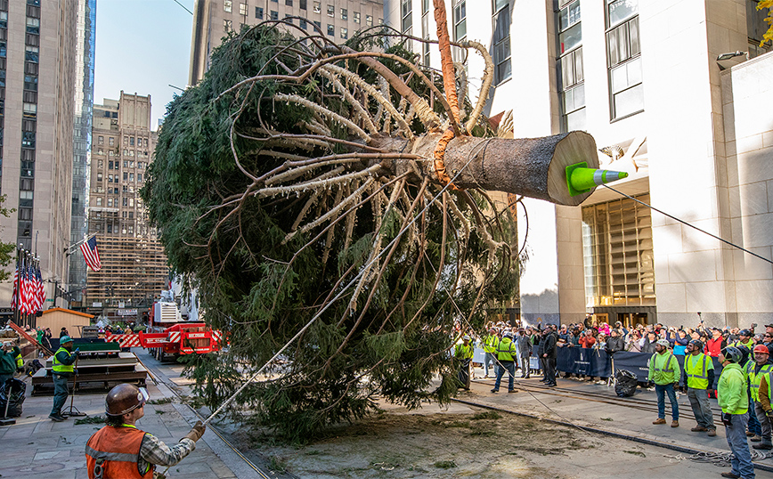 Τεράστιο χριστουγεννιάτικο δέντρο, μία νορβηγική ελάτη μήκους 24 μέτρων που μεταφέρθηκε με κάθε… επισημότητα στο αίθριο του Ροκφέλερ, ενώ πλήθος κόσμου χειροκροτούσε και έβγαζε αναμνηστικές φωτογραφίες.