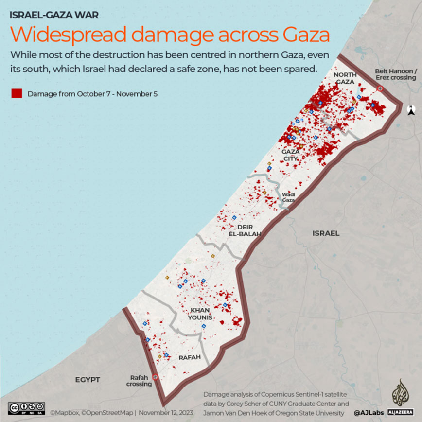 Ο παρακάτω χάρτης της Λωρίδας της Γάζας δείχνει τα χτυπήματα που έχουν καταγραφεί από τις 7 Οκτωβρίου έως και τις 5 Νοεμβρίου.