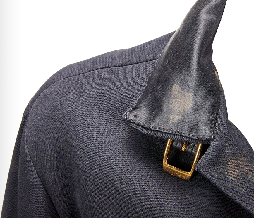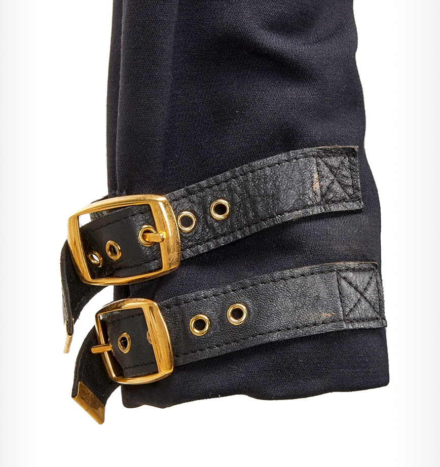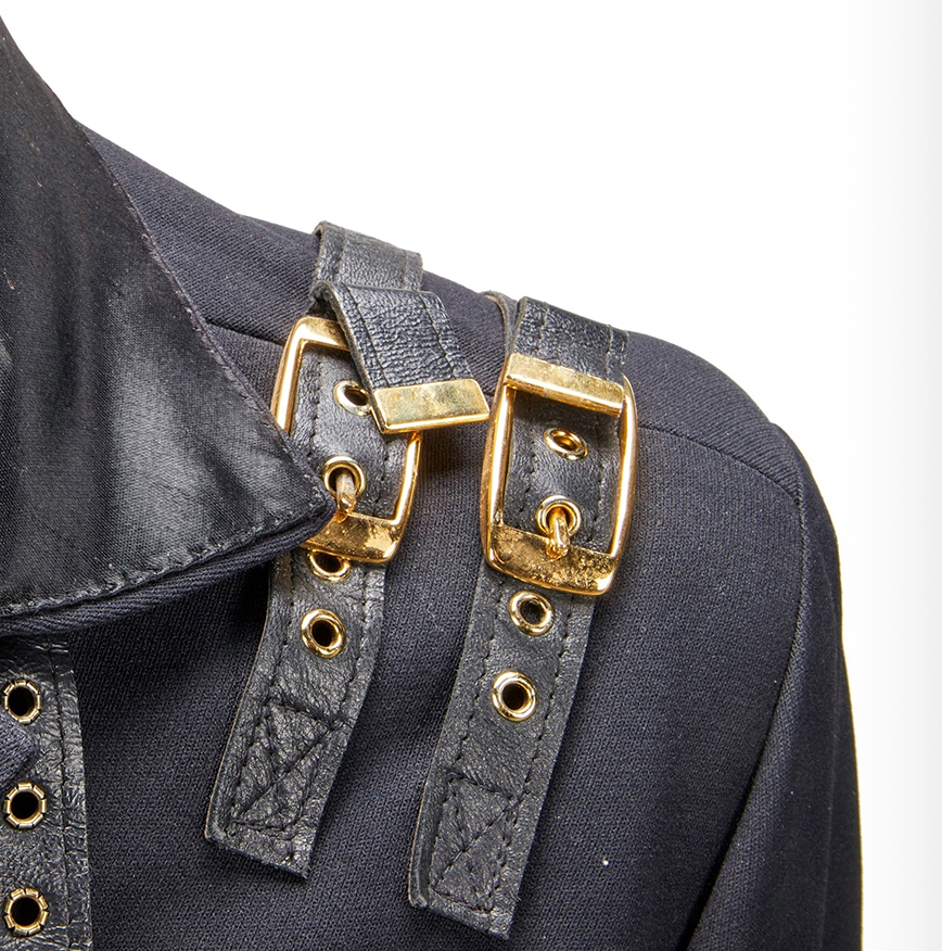 Το σακάκι αποτελείται από μαύρο πολυεστέρα, σατέν γιακά, δερμάτινα λουράκια με χρυσούς δακτύλιους, αγκράφες και φερμουάρ στο μπροστινό μέρος, στα μανίκια και στους ώμους του. Τα δερμάτινα λουράκια, οι αγκράφες και τα φερμουάρ είναι καθαρά διακοσμητικά και δεν διαθέτει τσέπες ή εσωτερικές θήκες.