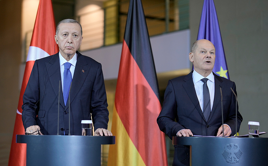 Σταθεροί στις θέσεις τους για την κρίση στη Μέση Ανατολή παρέμειναν τόσο ο καγκελάριος Όλαφ Σολτς όσο και ο πρόεδρος της Τουρκίας Ταγίπ Ερντογάν, κατά την εμφάνισή τους νωρίτερα απόψε ενώπιον του Τύπου, πριν από το δείπνο εργασίας τους στην καγκελαρία.