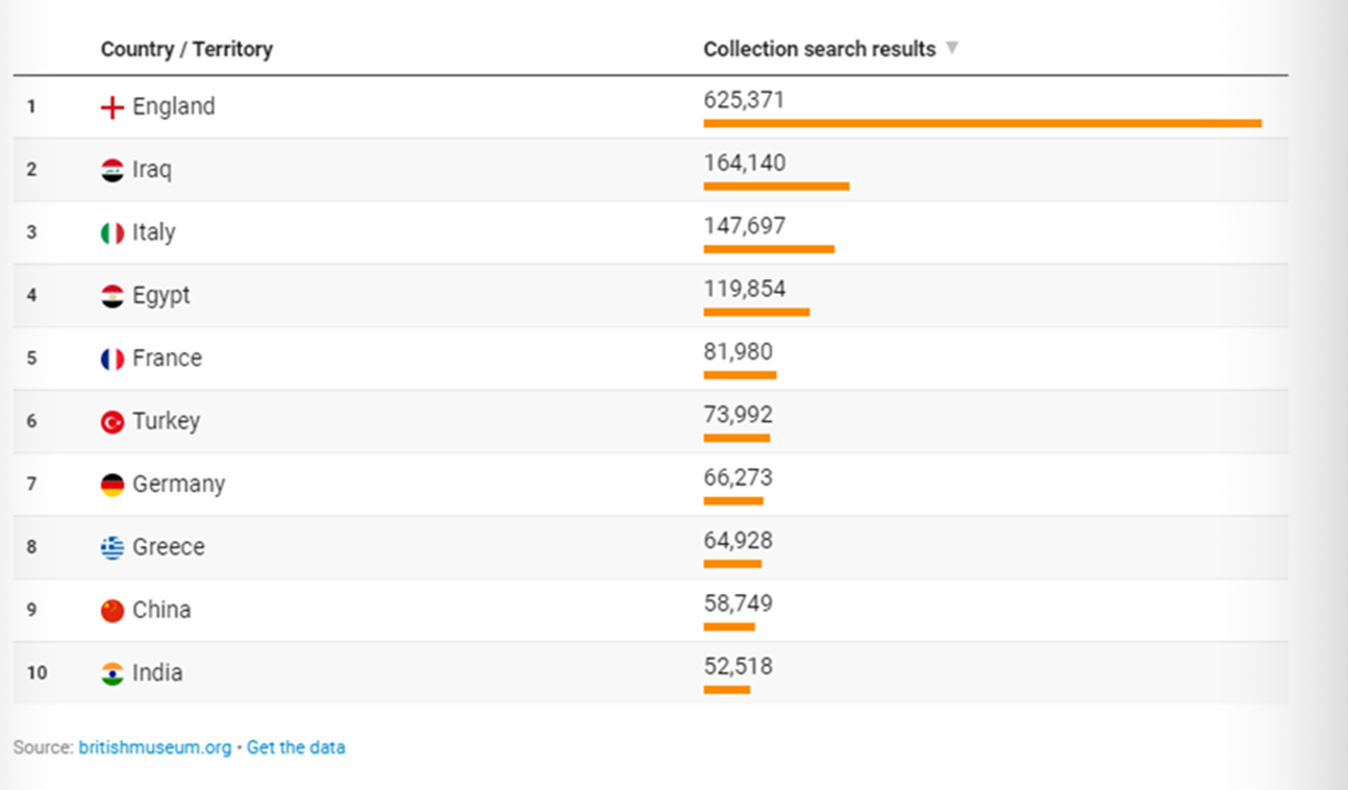 Μια έρευνα από το Al Jazeera αποκαλύπτει πως στην ηλεκτρονική βάση δεδομένων του Βρετανικού Μουσειόυ, έχουν καταγραφεί επίσημα 2,2 εκατομμύρια αντικείμενα από τουλάχιστον 212 διαφορετικές χώρες σε όλο τον κόσμο. Και η συνολική συλλογή αντικειμένων είναι ενδεχομένως πολύ μεγαλύτερη, όπως μαρτυρά το πρόσφατο σκάνδαλο κλοπής και πώλησης αρχαιοτήτων, που βρίσκονταν «ξεχασμένα» στις αποθήκες του.