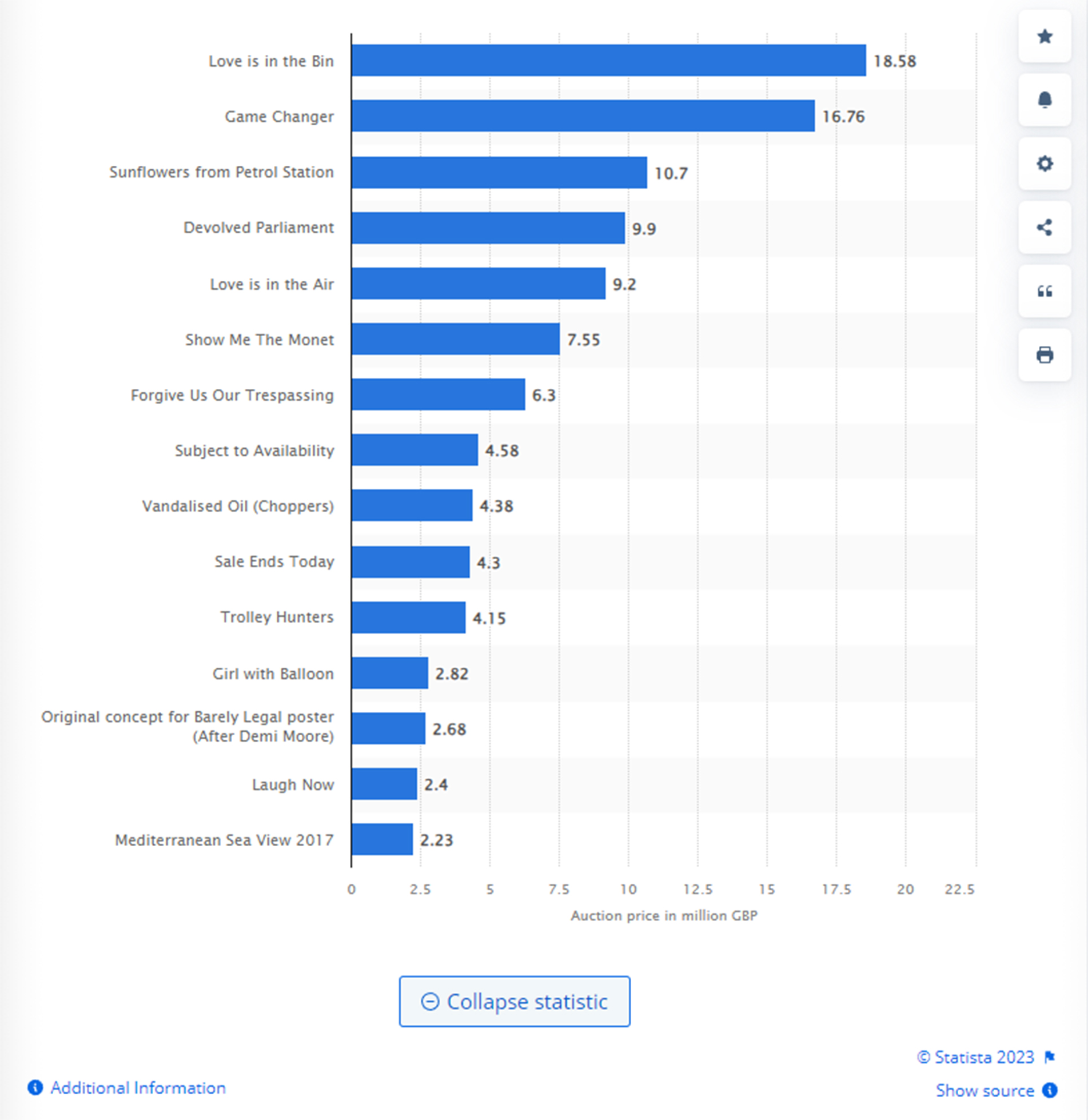 Ορισμένα από τα πιο εμβληματικά και πιο ακριβά έργα του Banksy όπως έχουν καταγραφεί από την πλατφόρμα δεδομένων Statista: