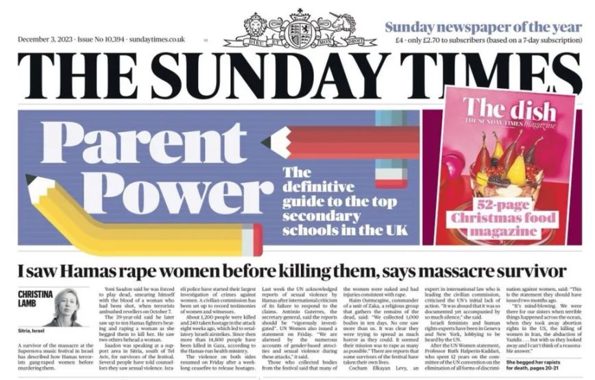 Μια «όμορφη γυναίκα με πρόσωπο αγγέλου» βιάστηκε από οκτώ έως δέκα άντρες της Χαμάς στο Ισραήλ στις 7 Οκτωβρίου, ενώ ένα άλλο θύμα αποκεφαλίστηκε με φτυάρι στην προσπάθειά του να υπερασπιστεί τον εαυτό του, λέει ένας 39χρονος, που κατάφερε να επιζήσει. Ο Yoni Saadon, πατέρας τεσσάρων παιδιών, δήλωσε στη βρετανική εφημερίδα «Sunday Times» ότι τον στοιχειώνουν ακόμη οι φρικτές σκηνές που είδε στο μουσικό φεστιβάλ Nova, όταν Παλαιστίνιοι έσφαξαν τουλάχιστον 364 επισκέπτες του φεστιβάλ, μεταξύ των οποίων και μια γυναίκα, που βιάστηκε ομαδικά και παρακαλούσε να τη σκοτώσουν.