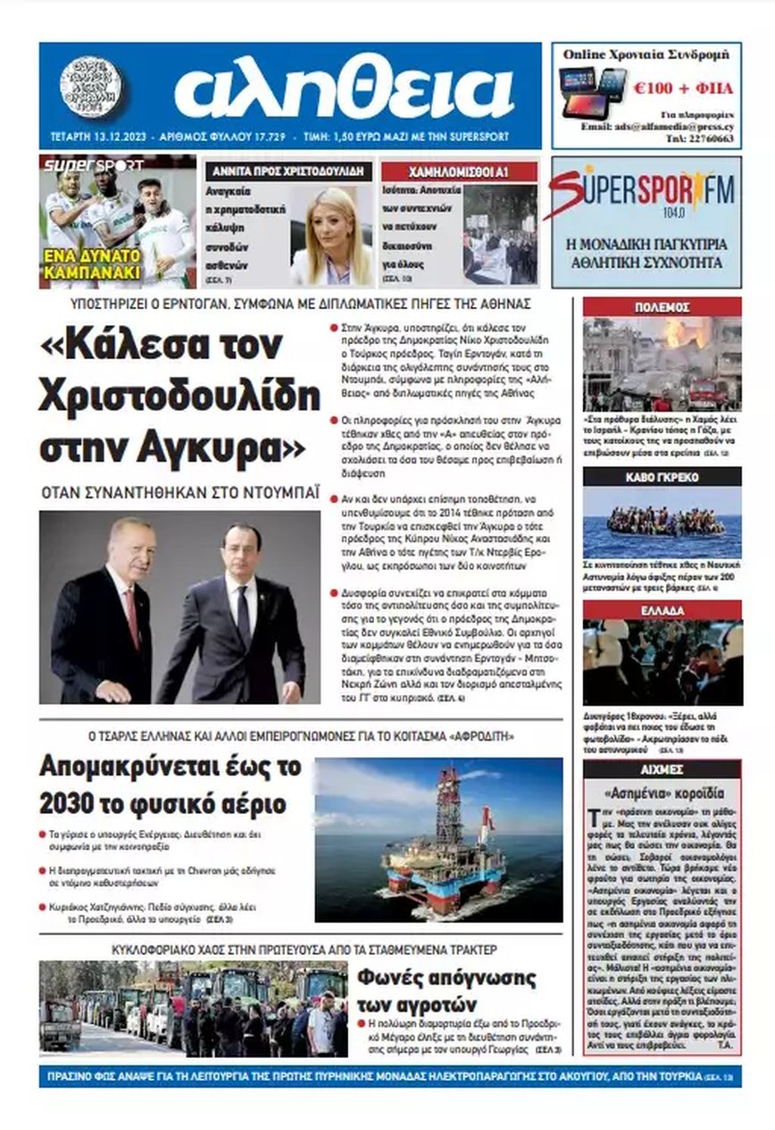 Αναστάτωση έχει προκληθεί στην Κύπρο από δημοσίευμα της εφημερίδας «Αλήθεια» που αναφέρει ότι ο Τούρκος Πρόεδρος Ρετζέπ Ταγίπ Ερντογάν κάλεσε τον Κύπριο Πρόεδρο Νίκο Χριστοδουλίδη στη Τουρκία «για να τα πουν». Σύμφωνα με το δημοσίευμα, το θέμα του οποίου προκάλεσε αντιπαράθεση μεταξύ κυβέρνησης και αντιπολίτευσης στη Μεγαλόνησο, η πρόσκληση απευθύνθηκε κατά τη διάρκεια σύντομης συνομιλίας που είχαν Ερντογάν και Χριστοδουλίδης τη 1η Δεκεμβρίου, στο Ντουμπάι.