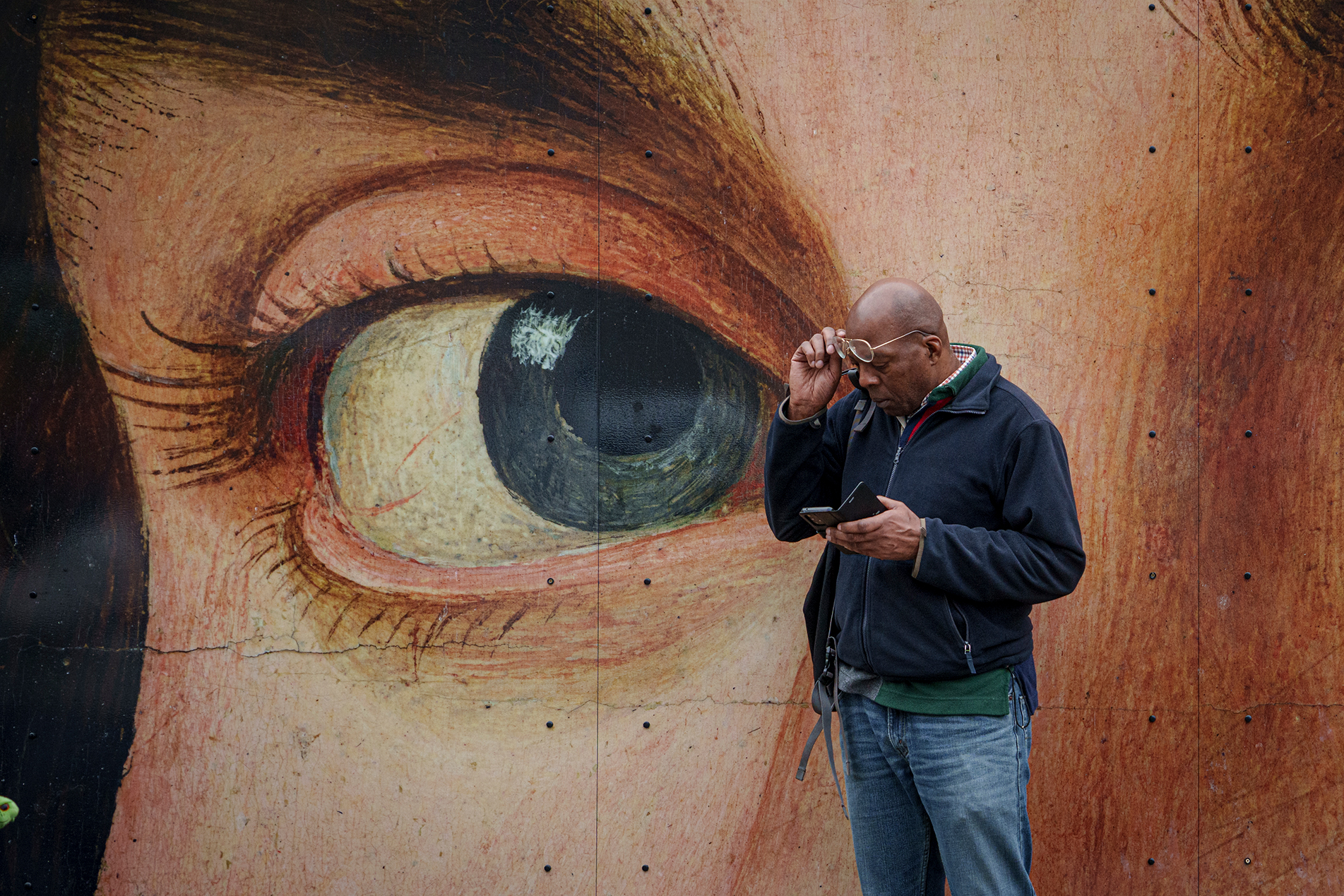 Ένας άνδρας κοιτάζει το τηλέφωνό του δίπλα στον πίνακα του Ιταλού καλλιτέχνη Antonello da Messina έξω από την Εθνική Πινακοθήκη στην πλατεία Τραφάλγκαρ του Λονδίνου. Στις 10 Μαΐου 2024, η Εθνική Πινακοθήκη θα γιορτάσει τα 200 χρόνια από την ίδρυσή της, όποτε, την ίδια μέρα, θα εγκαινιαστούν 12 εκθέσεις, σε 12 μουσεία και γκαλερί στις 12 περιφέρειες των τεσσάρων εθνών του Ηνωμένου Βασιλείου.