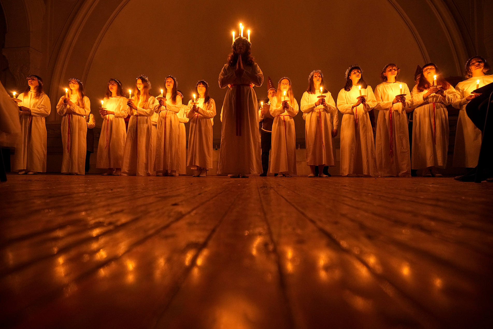 Στο άλλο μέτωπο του πολέμου, νεαρές γυναίκες και άνδρες της Ρωσίας τραγουδούν τα κάλαντα καθώς κρατούν κεριά για να γιορτάσουν την Ημέρα της Αγίας Λουκίας στην Ευαγγελική Λουθηρανική Εκκλησία της Αγίας Αικατερίνης στην Αγία Πετρούπολη. Η εκκλησία χτίστηκε τον 19ο αιώνα από και για τους Σουηδούς ομογενείς στην Αγία Πετρούπολη και συνήθως αποκαλείται Σουηδική εκκλησία. Σημειώνεται πως η Αγία Λουκία είναι η προστάτιδα αγία της όρασης.