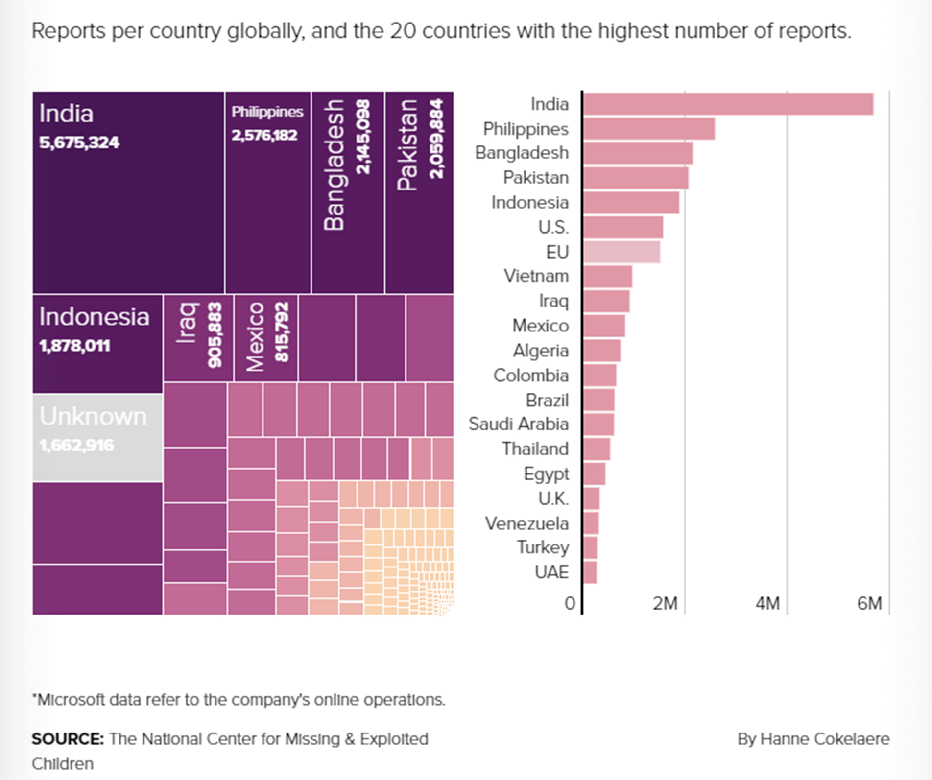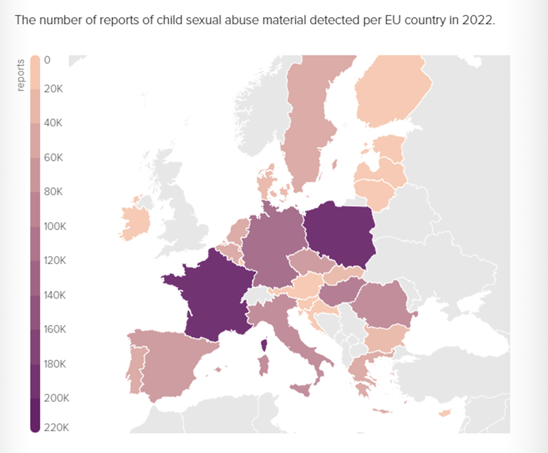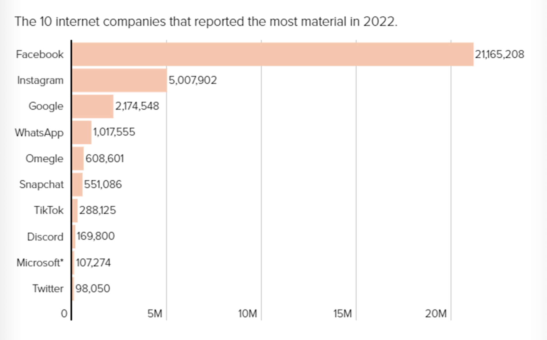 Το 2022, ο γίγαντας των μέσων κοινωνικής δικτύωσης Meta Platforms (Facebook, Instagram) εντόπισε και ανέφερε 26 εκατομμύρια εικόνες. Οι αγαπημένες εφαρμογές των εφήβων Snapchat και TikTok υπέβαλαν αντίστοιχα περισσότερες από 550.000 και 290.000 αναφορές στο Εθνικό Κέντρο για τα Εξαφανισμένα και Εκμεταλλευόμενα Παιδιά των ΗΠΑ, έναν οργανισμό που εστιάζει στο περιεχόμενο σεξουαλικής κακοποίησης παιδιών (CSAM) στο διαδίκτυο.