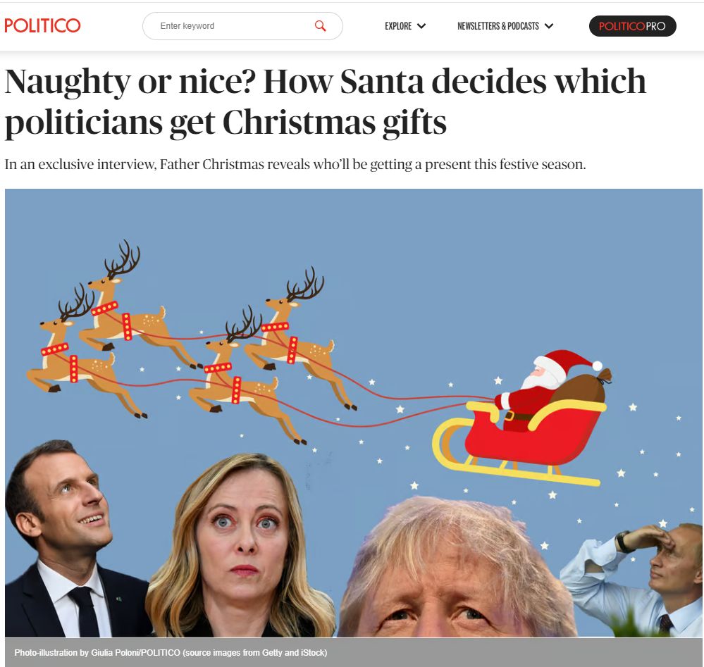 Ένα ιδιαίτερο θέμα δημοσίευσε το Politico, συνδυάζοντας το εορταστικό κλίμα με τις πολιτικές εξελίξεις. Πιο συγκεκριμένα, πήρε «αποκλειστική συνέντευξη» από τον «Άγιο Βασίλη» και τον ρώτησε για τους Ευρωπαίους ηγέτες και τα δώρα που θα τους έκανε.