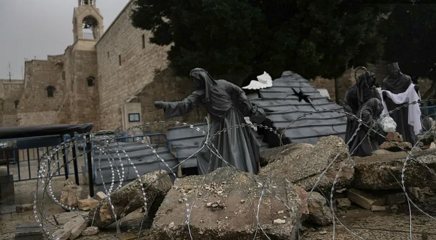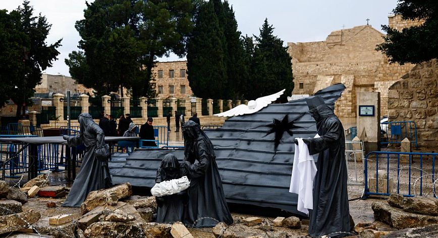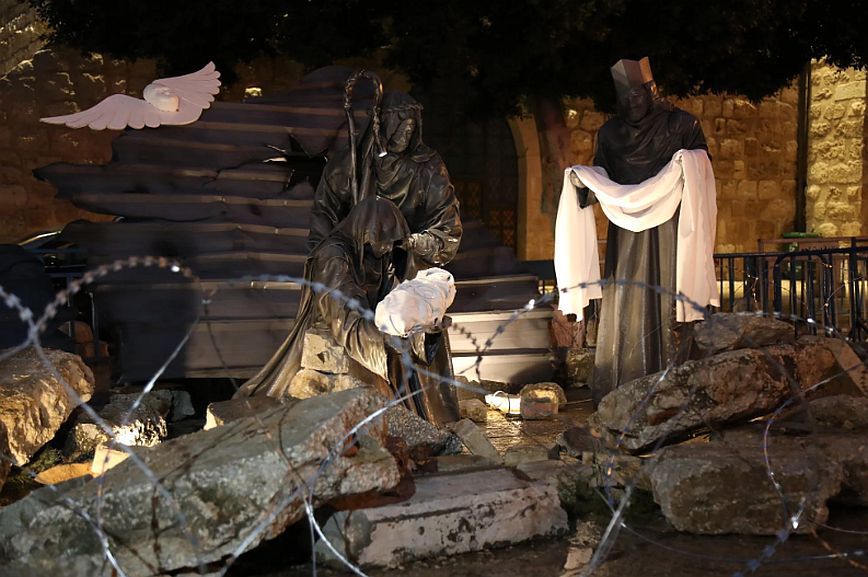 Η σκηνή της φάτνης η οποία περιτριγυρίζεται από ερείπια που συμβολίζουν την καταστροφή στη Λωρίδα της Γάζας, αλλά και τα λευκά σεντόνια που αναφέρονται στους νεκρούς αμάχους έχει στηθεί δίπλα στην εκκλησία της γέννησης.