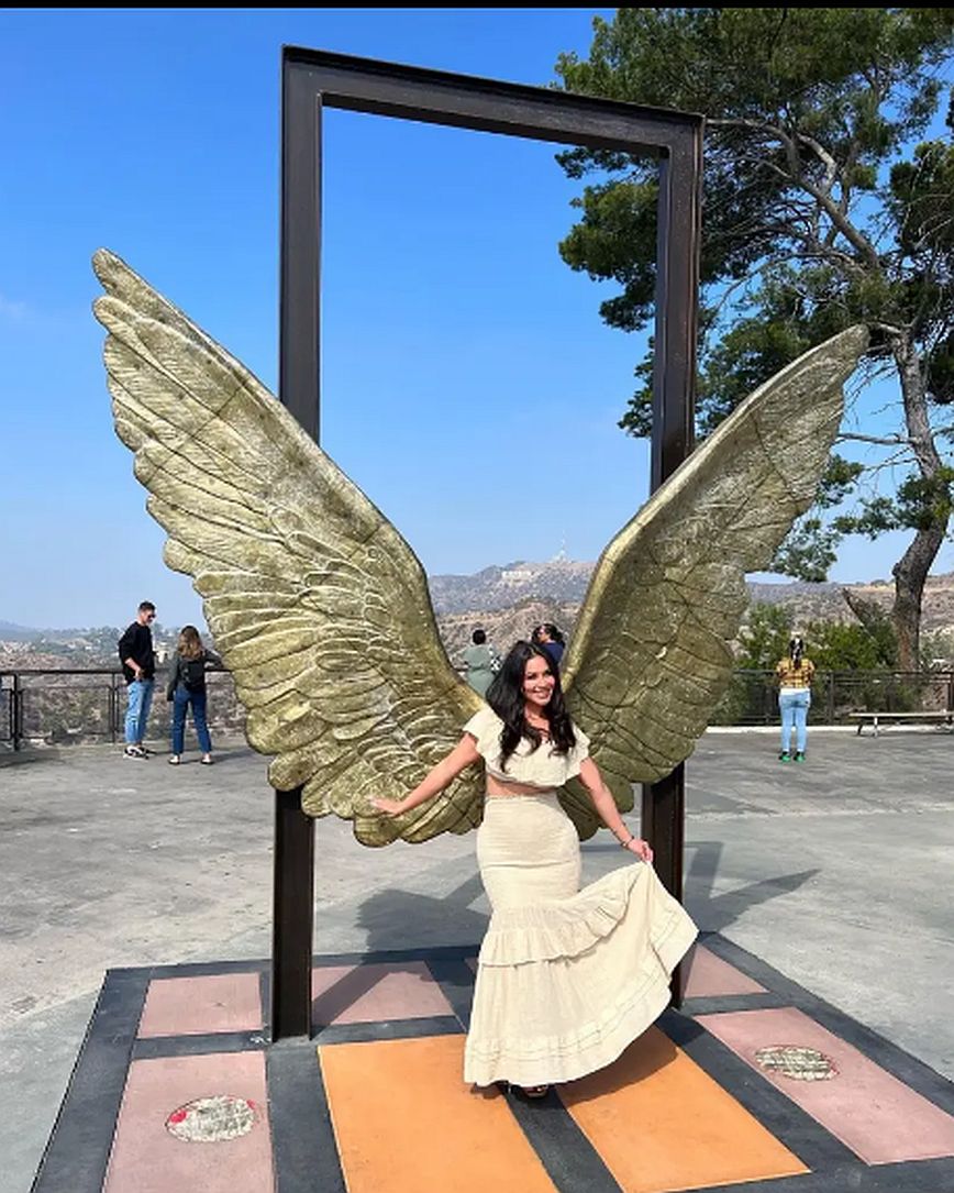 Μια φωτογραφία της Cachuela στην Καλιφόρνια πέρυσι την δείχνει να στέκεται μπροστά από ένα ζευγάρι μεγάλα φτερά αγγέλου με την πινακίδα του Χόλιγουντ να είναι ορατή πίσω της.