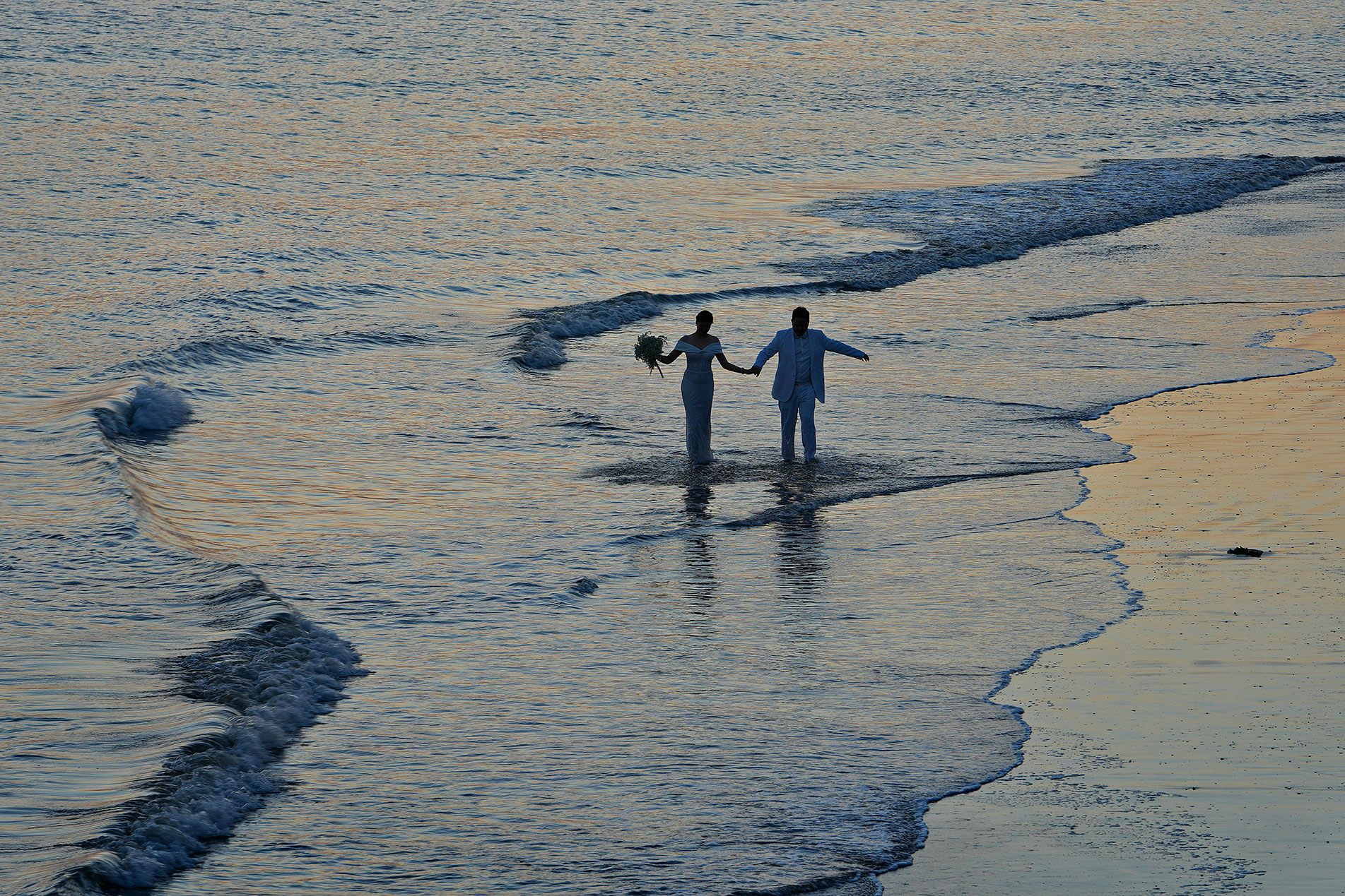 Νεόνυμφοι στην Κίνα περπατούν στην παραλία κατά το ηλιοβασίλεμα για να βγάλουν τις γαμήλιες φωτογραφίες τους. Κρατώντας ο ένας το χέρι του άλλου, δείχνουν πόσο σημαντικό είναι να μοιράζεται κανείς το μέλλον του με τους αγαπημένους του ανθρώπους.