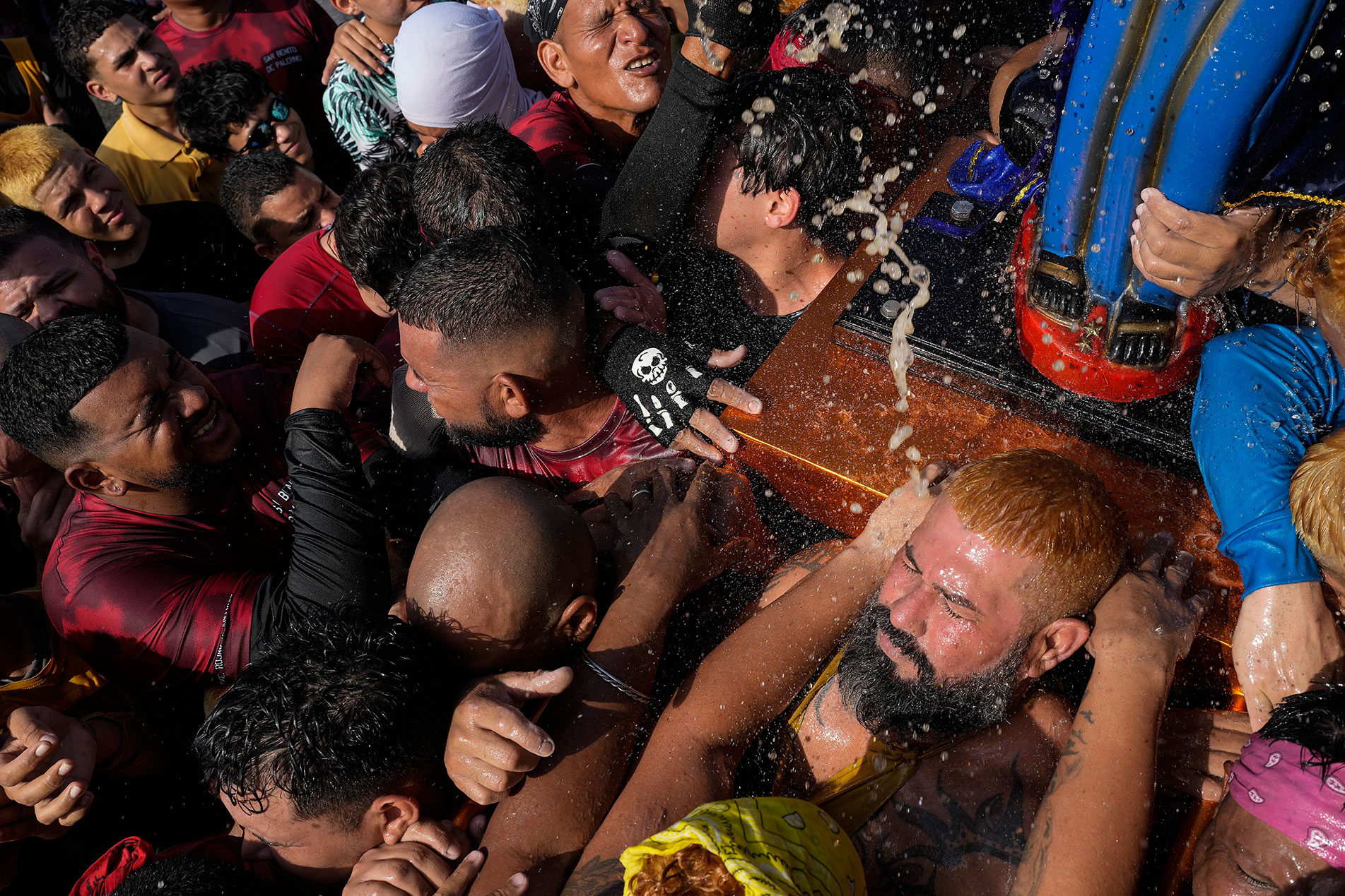 Οι πιστοί περιέλουσαν με ρούμι το άγαλμα του Αγίου Βενέδικτου του Παλέρμο κατά τη διάρκεια πομπής προς τιμήν του προστάτη αγίου της Cabimas, στη Βενεζουέλα. Οι ίδιοι μεταφέρουν το άγαλμα του Αγίου Βενέδικτου στην πολιτεία Zulia της Βενεζουέλας.