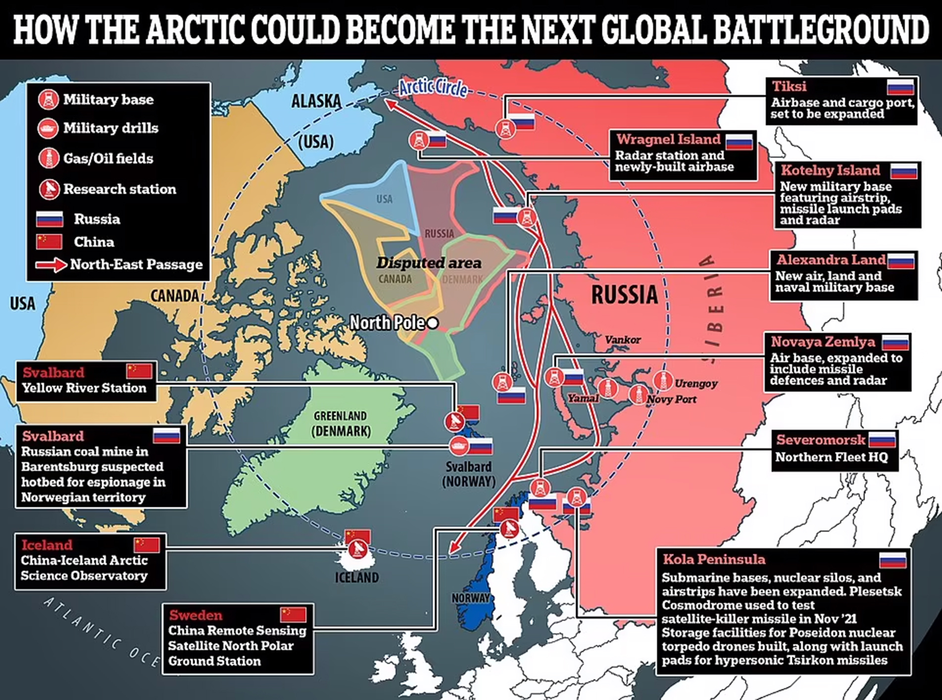 Η Ρωσία έχει επίσης επενδύσει τεράστια κεφάλαια στην ανάπτυξη στρατιωτικών υποδομών στον Αρκτικό Κύκλο, ήδη από το 2014. Πάνω από 50 στρατιωτικές βάσεις της Σοβιετικής Εποχής, συμπεριλαμβανομένων αεροδρομίων, ραντάρ, λιμανιών, ναυπηγείων και βάσεις εκτόξευσης πυραύλων έχουν ανακαινιστεί. Επίσης άλλες έχουν επεκταθεί για να φιλοξενήσουν ακόμη μεγαλύτερες δυνάμεις, μεταξύ των οποίων πυρηνικών βομβαρδιστικών και πυραύλων. Το πυρηνικό οπλοστάσιο της Ρωσίας είναι ενσωματωμένο στο Βόρειο Στόλο της.