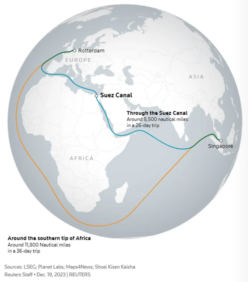 Σύμφωνα με τον ναυλομεσιτικό οίκο Linerlytica, έως τις 31 Δεκεμβρίου διακόσια εξήντα δύο (262) πλοία μεταφοράς εμπορευματοκιβωτίων είχαν εκτραπεί προς τη διαδρομή του Ακρωτηρίου της Καλής Ελπίδας, με συνολική χωρητικότητα 3,4 εκατ. TEUs ή το 12% της παγκόσμιας χωρητικότητας.