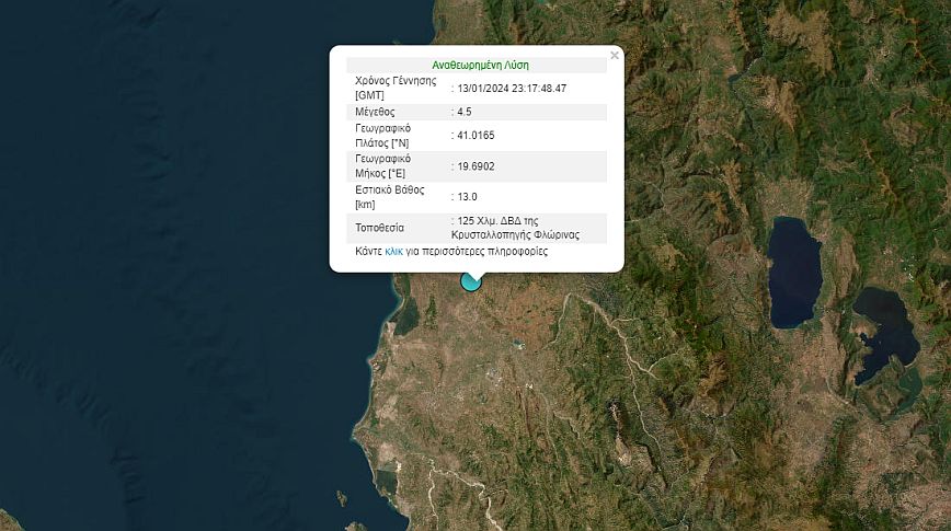 Εκ μέρους των τεσσάρων φορέων συγκρότησης του Ενιαίου Εθνικού Σεισμολογικού Δικτύου, το Γεωδυναμικό Ινστιτούτο του Εθνικού Αστεροσκοπείου Αθηνών ανακοίνωσε ότι στη 01:17 (ώρα Ελλάδος), καταγράφηκε σεισμική δόνηση, μεγέθους 4,5 βαθμών στην κλίμακα Ρίχτερ, το επίκεντρο της οποίας εντοπίζεται 125 χιλιόμετρα δυτικά-βορειοδυτικά της Κρυσταλλοπηγής Φλώρινας.