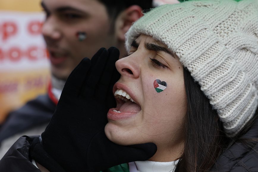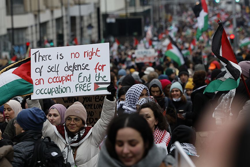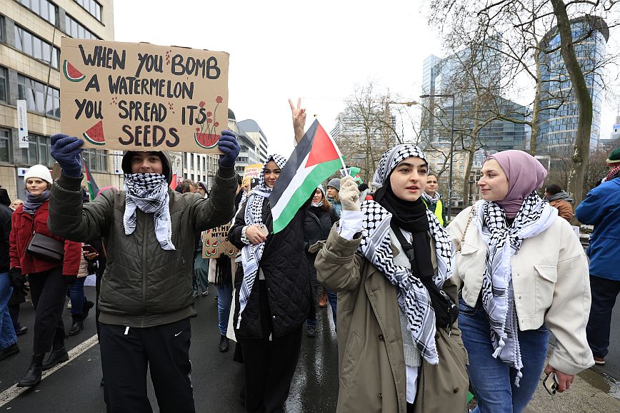 Στη σημερινή διαδήλωση, υπό ένα πανώ με το σύνθημα «Δικαιοσύνη για την Παλαιστίνη», οι συγκεντρωμένοι φώναζαν συνθήματα όπως «Σταματήστε τη γενοκτονία», «Το Ισραήλ είναι τρομοκράτης» και «Απελευθερώστε τη Γάζα». Ορισμένοι επέκριναν την ΕΕ για την «ντροπιαστική αδυναμία της να προστατεύσει τους άμαχους Παλαιστίνιους, άλλοι ζητούσαν μποϊκοτάζ των ισραηλινών προϊόντων και επιχειρήσεων.