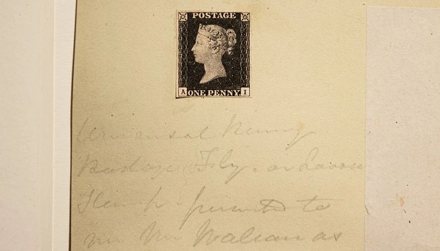 Η επάνω δεξιά γωνία του φακέλου φέρει ένα γραμματόσημο “Penny Black” (Μαύρη Πέννα), το πρώτο που εκδόθηκε στη Βρετανία και σε όλο τον κόσμο. Το γραμματόσημο απεικονίζει σε προφίλ τη βασίλισσα Βικτώρια του Ηνωμένου Βασιλείου σε μαύρο φόντο και έχει τις “postage” (ταχυδρομείο) και “penny” (πέννα).