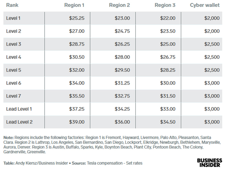 Η Tesla χωρίζει τους εργάτες του εργοστασίου της σε επτά επίπεδα, ενώ οι επικεφαλής χωρίζονται σε δύο επίπεδα. Για παράδειγμα, οι εργαζόμενοι του επιπέδου 1 στο εργοστάσιο Φρεμόντ λαμβάνουν 25,25 δολάρια την ώρα σύμφωνα με τη νέα δομή αποζημίωσης, ενώ οι εργαζόμενοι του επιπέδου 7 αμείβονται με 35,50 δολάρια. Εν τω μεταξύ, οι εργαζόμενοι επιπέδου 1 στις περιοχές με τις χαμηλότερες αμοιβές παίρνουν 22 δολάρια την ώρα.