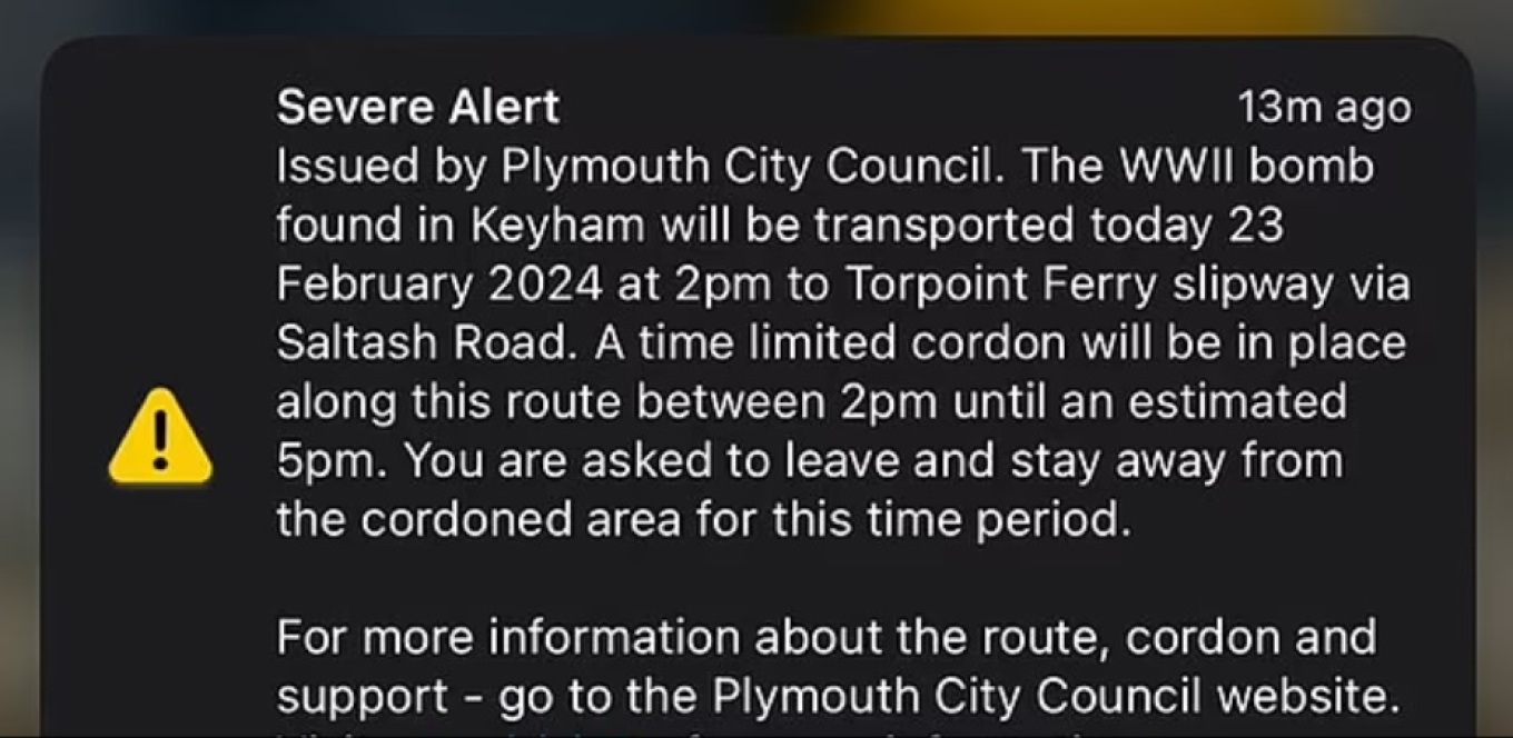 Συναγερμός σήμανε στο Πλίμουθ της Βρετανίας έπειτα από μήνυμα που εστάλη στα κινητά κατοίκων και τους ζητούσε να εγκαταλείψουν τα σπίτια τους, λόγω μιας βόμβας του Β’ Παγκοσμίου Πολέμου που εντοπίστηκε τις προηγούμενες ημέρες στον κήπο ενός σπιτιού, για την οποία οργανώθηκε μεγάλη επιχείρηση προκειμένου να απομακρυνθεί και να εξουδετερωθεί.