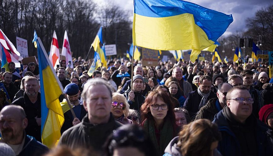 Κρατώντας γαλαζοκίτρινες ουκρανικές σημαίες και πανό με συνθήματα όπως: «Υπερασπιστείτε την Ουκρανία» και «εξοπλίστε την Ουκρανία τώρα» οι διαδηλωτές καταγγέλουν τον πόλεμο της Μόσχας.
