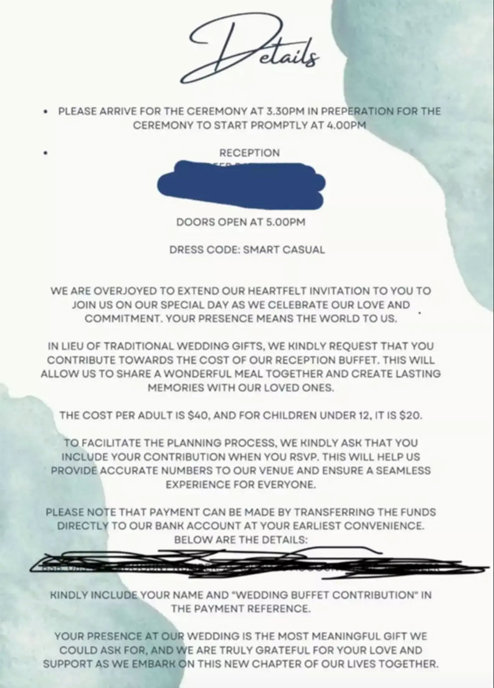 «Για να διευκολύνουμε τη διαδικασία προγραμματισμού, σας παρακαλούμε να συμπεριλάβετε τη συνεισφορά σας για το γεύμα στην απάντηση της πρόσκλησης», προστίθεται. «Παρακαλούμε να συμπεριλάβετε το όνομά σας και τη φράση “συνεισφορά στον γαμήλιο μπουφέ” στην αναφορά πληρωμής».