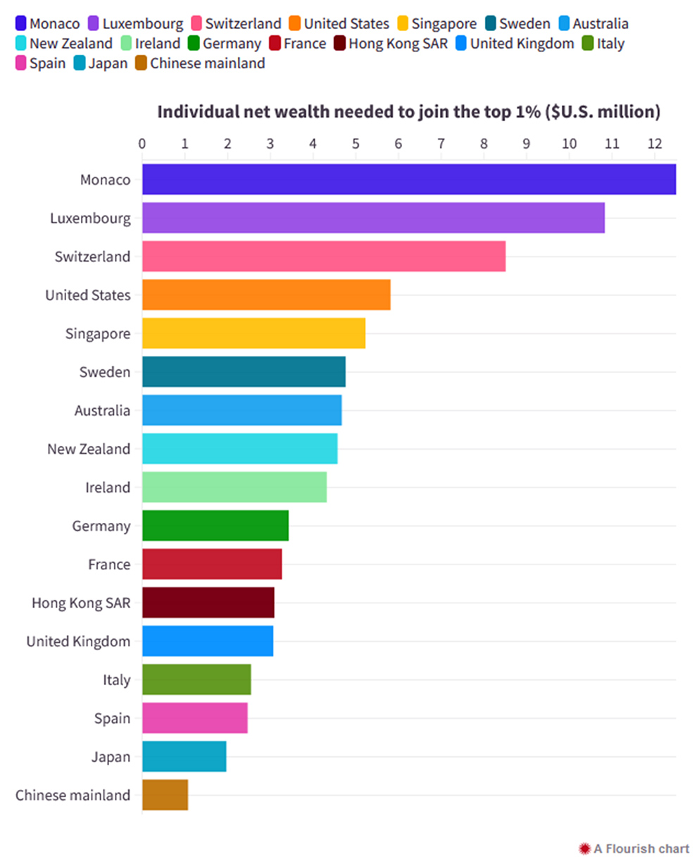 Δεύτερο στη σειρά είναι το Λουξεμβούργο, όπου για να μπει κανείς στο κλαμπ του 1% πρέπει να έχει τουλάχιστον 10,8 εκατ. δολάρια. Ακολουθεί η Ελβετία, όπου απαιτούνται 8,5 εκατ. δολάρια. Οι ΗΠΑ έρχονται στην τέταρτη θέση με 5,8 εκατ. δολάρια, αυξημένα κατά 15% σε σχέση με ένα χρόνο νωρίτερα.