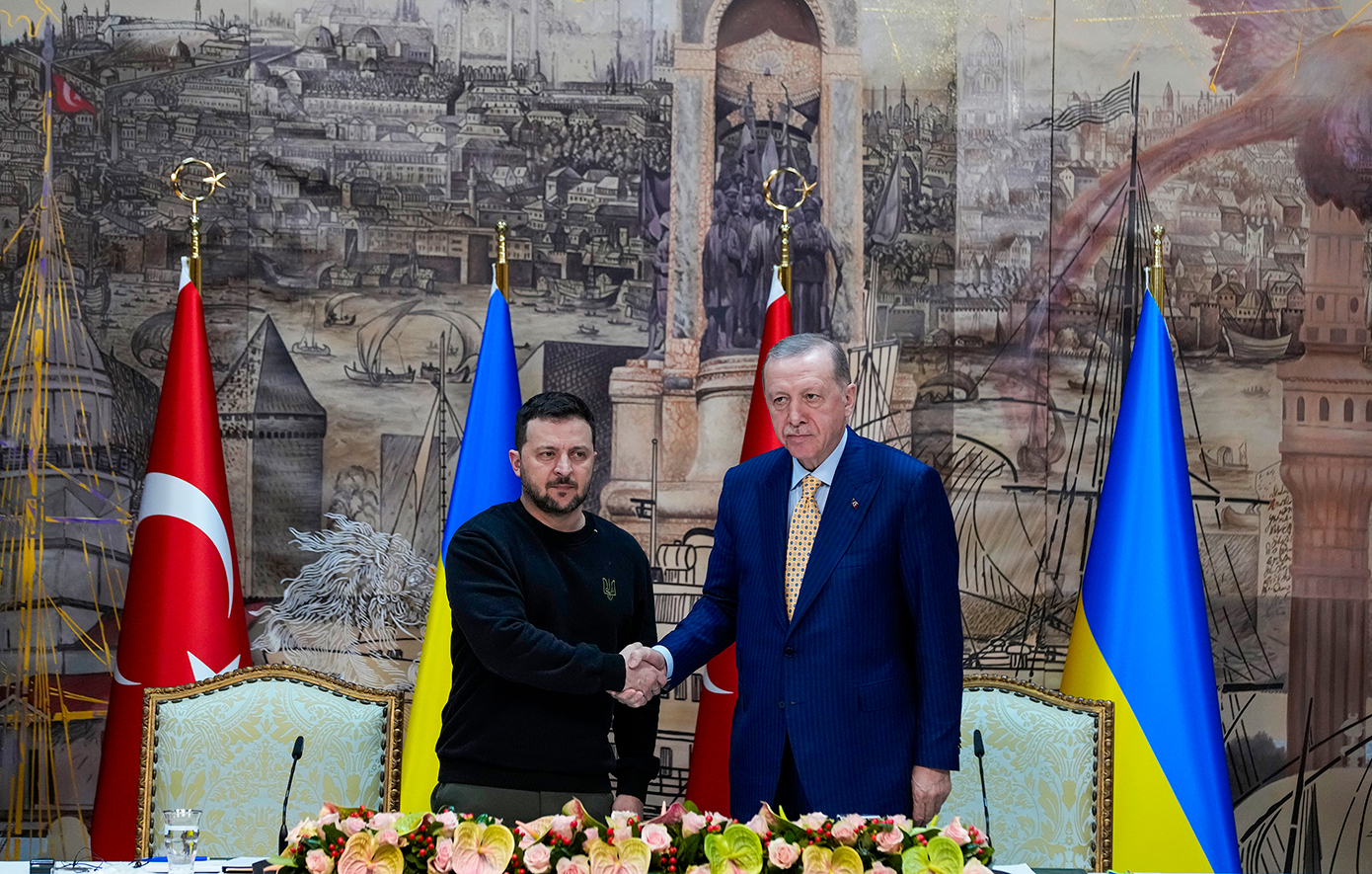 «Είμαστε έτοιμοι να φιλοξενήσουμε μια ειρηνευτική σύνοδο στην οποία θα μετάσχει η Ρωσία», δήλωσε ο αρχηγός του τουρκικού κράτους απευθυνόμενος στους δημοσιογράφους και έχοντας δίπλα του τον Ουκρανό πρόεδρο.
