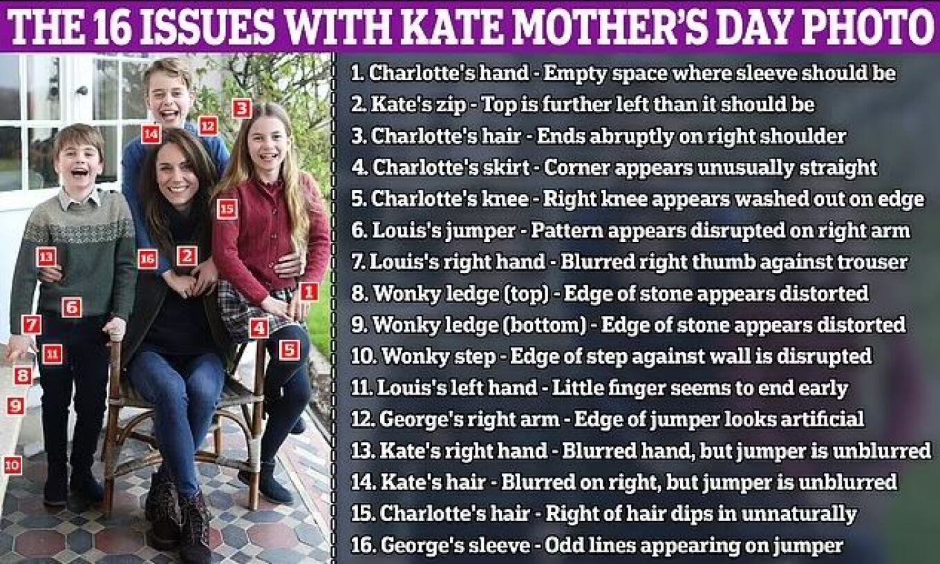 Η Daily Mail συγκέντρωσε τα 16 βασικά στοιχεία στη φωτογραφία που φανερώνουν το photoshop και εντοπίζονται τόσο στα άτομα που ποζάρουν, όσο και στο φόντο με τα αντικείμενα που περιέχει η εικόνα.