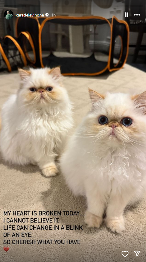 «Η καρδιά μου έχει ραγίσει σήμερα… Δεν μπορώ να το πιστέψω. Η ζωή μπορεί να αλλάξει εν ριπή οφθαλμού. Γι’ αυτό εκτιμήστε αυτά που έχετε» έγραψε η Κάρα Ντελεβίν σε στόρι που ανέβασε στο Instagram με μια φωτογραφία από τα δύο της γατάκια.
