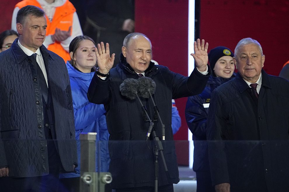 Με κραυγές «Ρωσία!«, «Ρωσία!» υποδέχθηκε το συγκεντρωμένο πλήθος τον Πούτιν που συνοδευόταν από τους τρεις εκλογικούς του «αντιπάλους» στην διαδικασία ψηφοφορίας που οργανώθηκε στην Ρωσία για την ανανέωση της προεδρικής του θητείας.