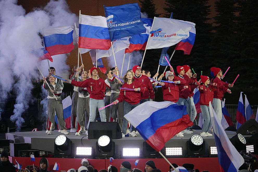 «Η επιστροφή στην πατρίδα αποδείχθηκε πιο δύσκολη, πιο τραγική, αλλά τα καταφέραμε και είναι ένα μεγάλο γεγονός στην ιστορία του κράτους μας», είπε ο Πούτιν πριν τραγουδήσει μαζί με το πλήθος τον εθνικό ύμνο.