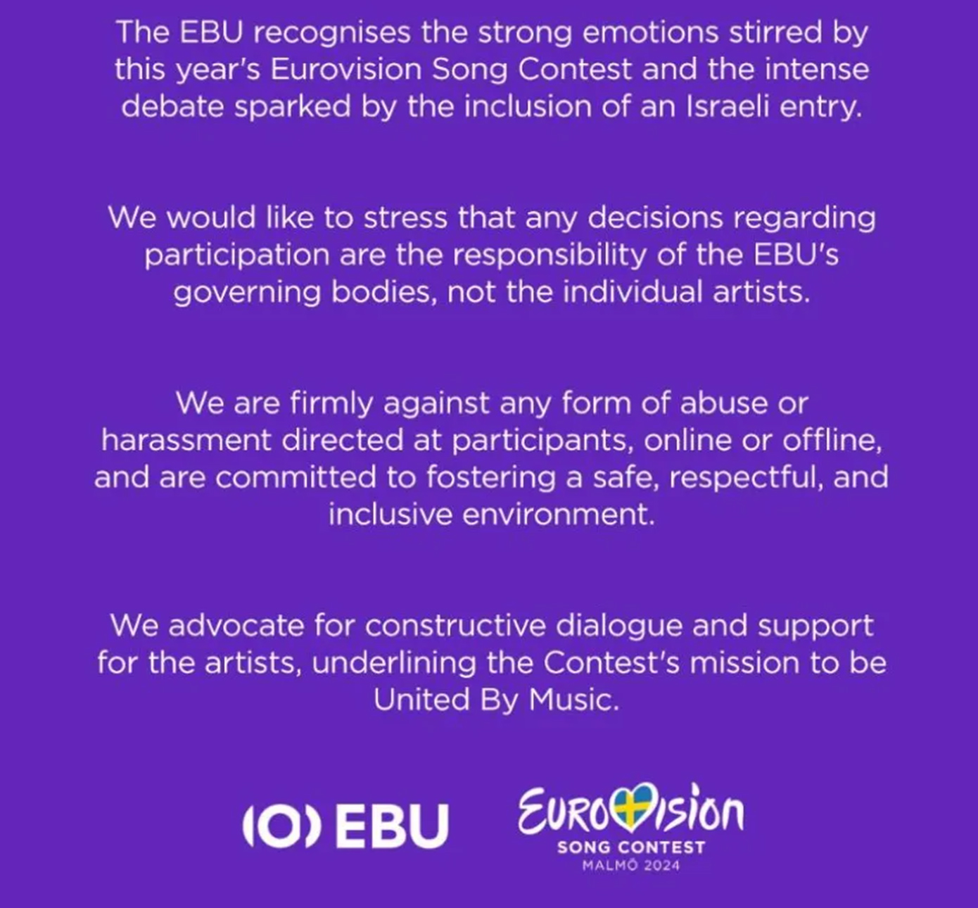 «Η EBU αναγνωρίζει τα έντονα συναισθήματα που προκαλούνται στον φετινό διαγωνισμό της Eurovision και την ισχυρή αντιπαράθεση που έχει προκαλέσει η συμμετοχή του Ισραήλ. Θα θέλαμε να ξεκαθαρίσουμε πως οποιαδήποτε απόφαση λαμβάνεται για τη συμμετοχή των χωρών στη διοργάνωση αφορά τους ιθύνοντες της EBU και όχι τους ίδιους τους καλλιτέχνες. Είμαστε ενάντια σε οποιαδήποτε μορφή κακομεταχείρισης ή παρενόχλησης σε βάρος των συμμετεχόντων, στο διαδίκτυο ή εκτός και δεσμευόμαστε να προωθήσουμε ένα ασφαλές, με σεβασμό και χωρίς αποκλεισμούς περιβάλλον. Υποστηρίζουμε τον εποικοδομητικό διάλογο και την υποστήριξη των καλλιτεχνών, υπογραμμίζοντας την αποστολή του Διαγωνισμού που είναι η ένωση μέσα από τη μουσική».