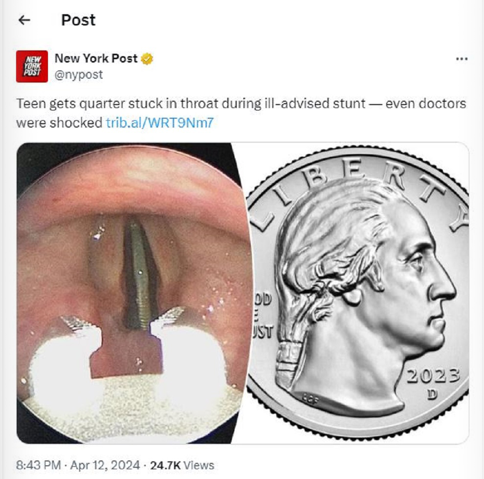 Σύμφωνα με τη New York Post, το κέρμα των 25 λεπτών ήταν κολλημένο για έξι ώρες στο λαιμό του εφήβου και σε πλάγια θέση, με τρόπο που δεν εμπόδιζε την είσοδο του αέρα. Έτσι, ο νεαρός εμφάνισε μόνο βραχνάδα και ένιωθε μια μικρή ενόχληση.