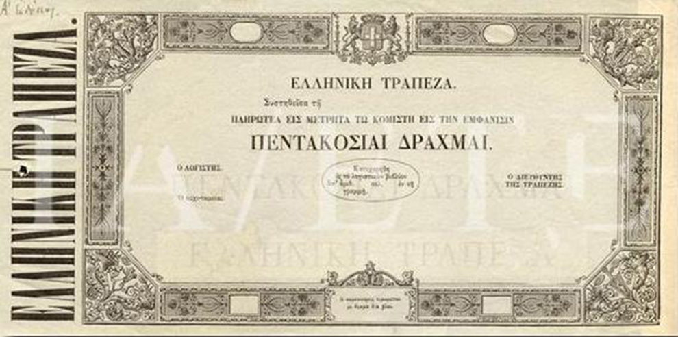 1841: Η νεοσύστατη Εθνική Τράπεζα εκδίδει το πρώτο της χαρτονόμισμα, ονομαστικής αξίας πεντακοσίων δραχμών.