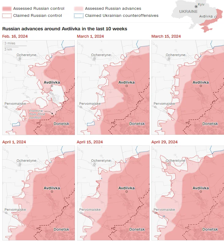 Στις 17 Φεβρουαρίου, η Ουκρανία αποσύρθηκε από την Αβντίβκα, μια πόλη που η Ρωσία φαίνεται να έχει θυσιάσει εκατοντάδες στρατεύματα, για να πάρει στην κατοχή της. Πριν μερικές εβδομάδες, οι ρωσικές δυνάμεις πήραν εδάφη δυτικά της περιοχής, καθώς το Κίεβο δεν είχε τις απαραίτητες δυνάμεις να αμυνθεί. Αυτό φαίνεται ξεκάθαρα στο γράφημα του «CNN».