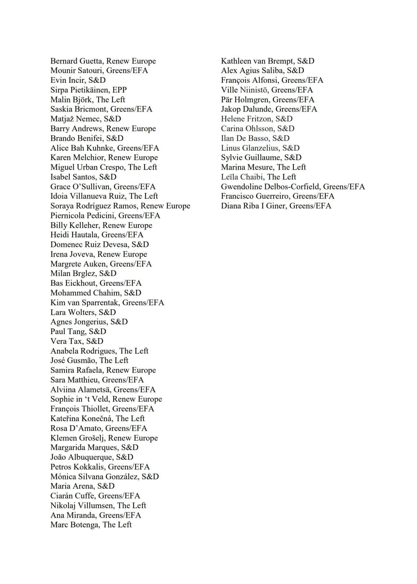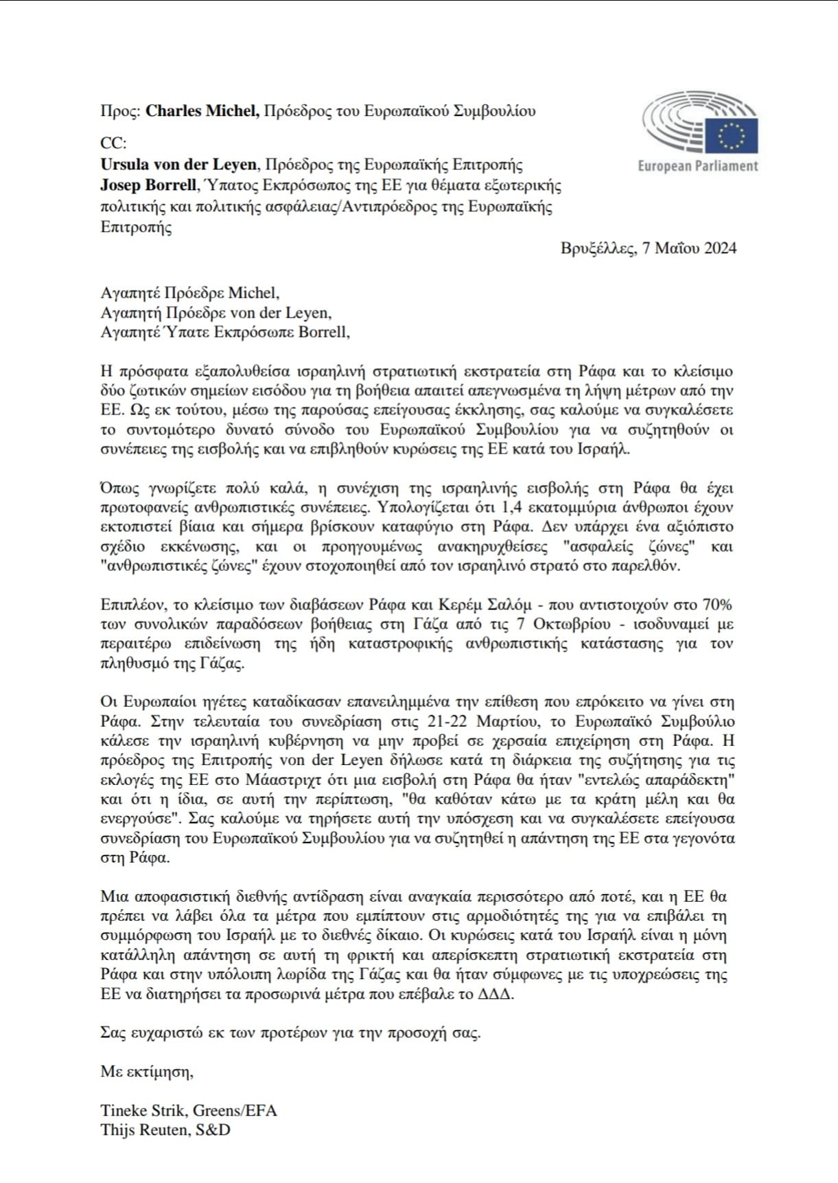 Οι ευρωβουλευτές από τα κόμματα των Σοσιαλιστών, της Αριστεράς, των Φιλελευθέρων και των Πρασίνων με την σημερινή επιστολή τους καλούν την Πρόεδρο να τηρήσει αυτή την υπόσχεση και να συγκαλέσει το Ευρωπαϊκό Συμβούλιο για να ληφθούν άμεσα, όσα μέτρα εμπίπτουν στις αρμοδιότητές της για να επιβάλει τη συμμόρφωση του Ισραήλ με το διεθνές δίκαιο και τα προσωρινά μέτρα που επέβαλε το ΔΔΔ.