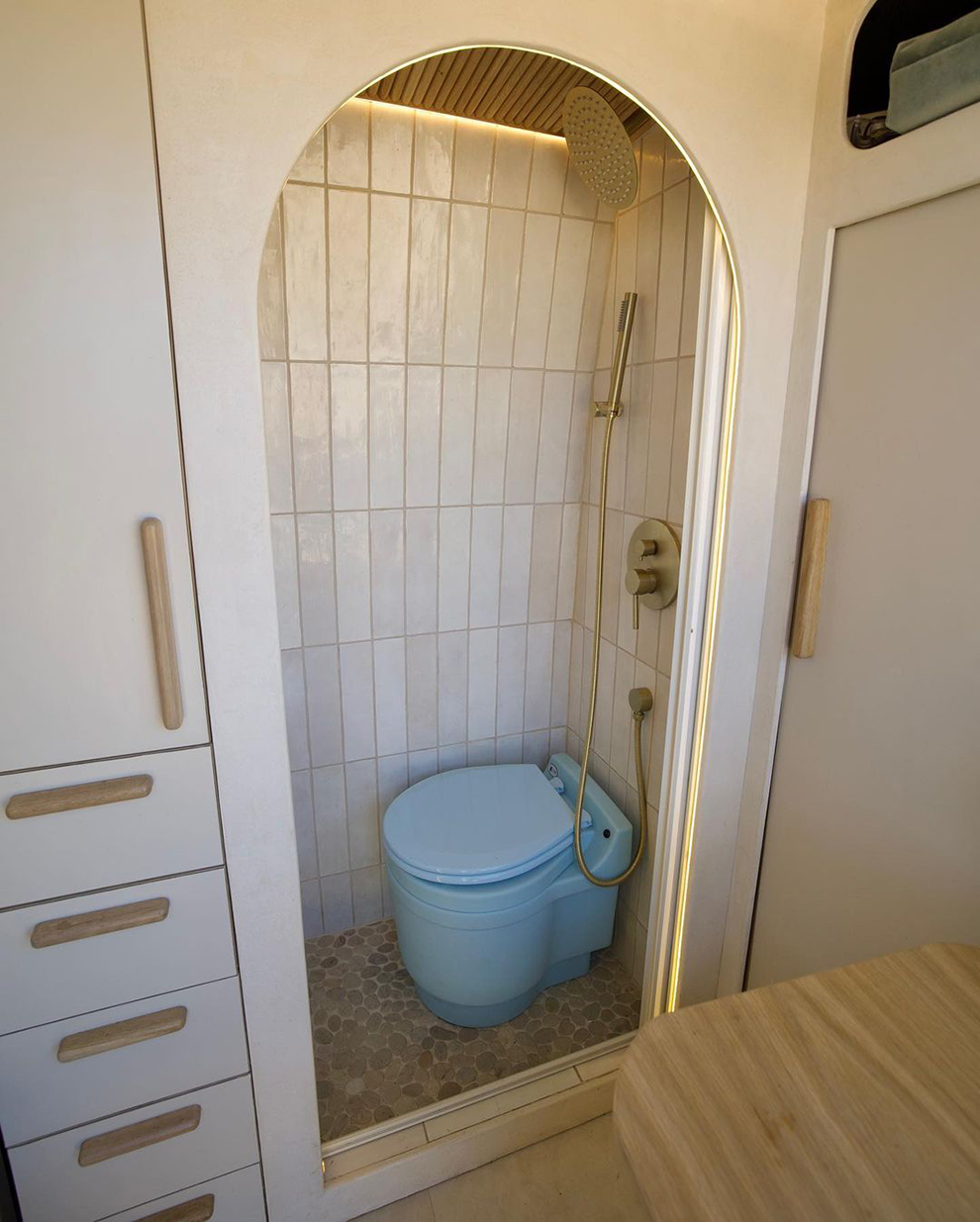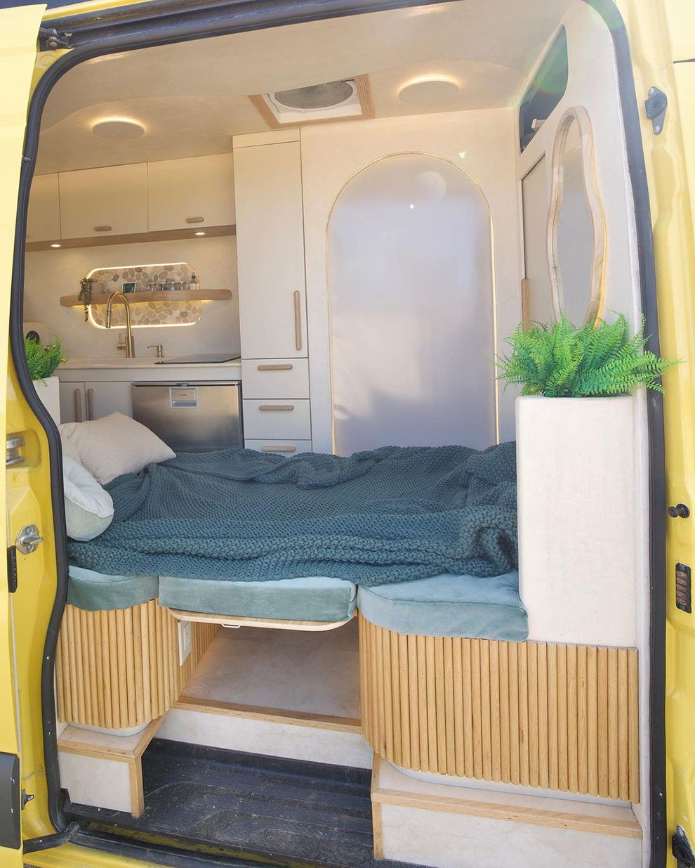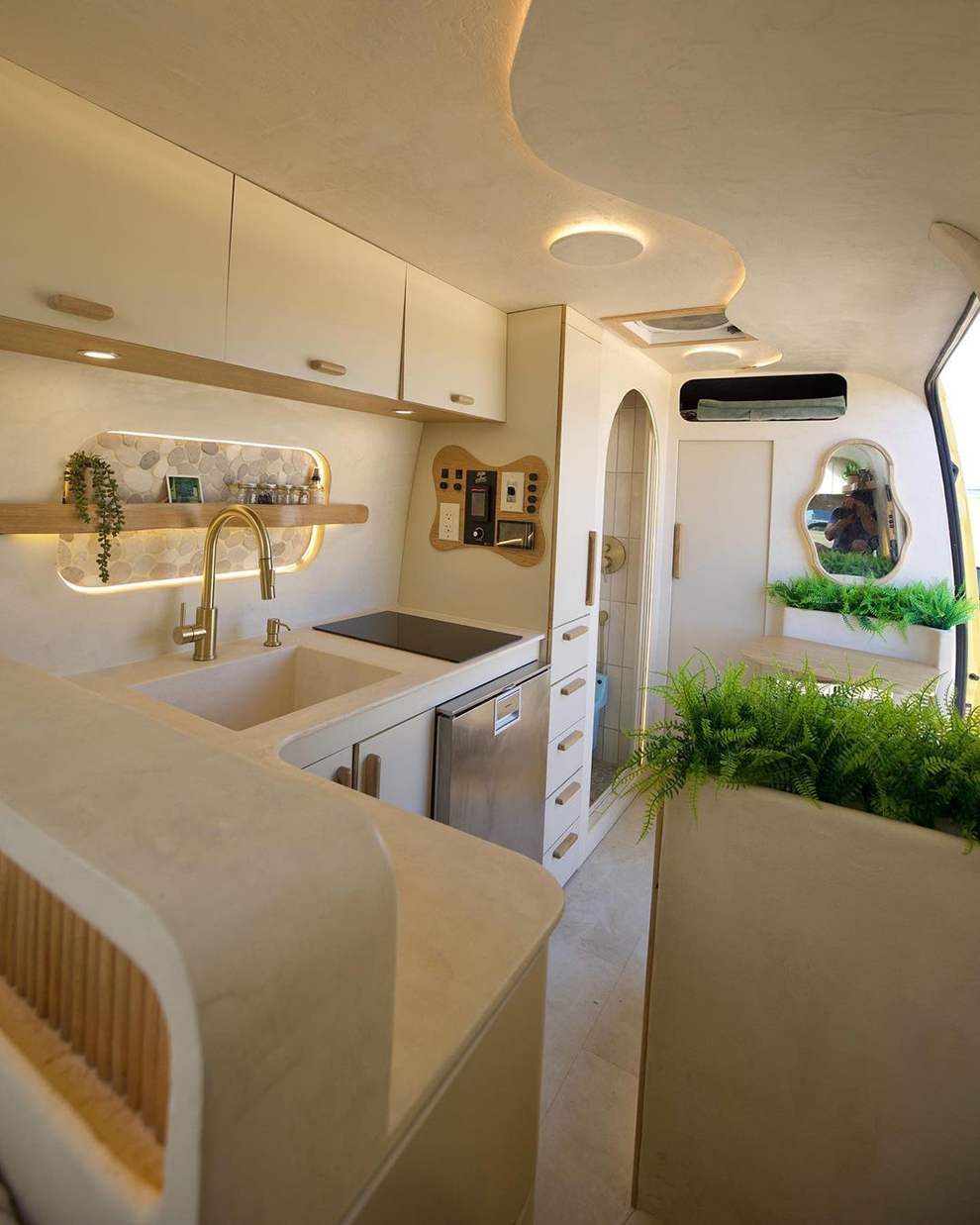 Ξοδεύοντας συνολικά 140.000 δολάρια λοιπόν, πρόσθεσε κουζίνα, κρεβάτι, μπάνιο και άλλες ανέσεις μέσα στο όχημα. Επίσης, τοποθέτησε εσωτερικούς τοίχους με Tadelakt, έναν σοβά που χρησιμοποιείται στη μαροκινή αρχιτεκτονική, ενώ έβαλε και fiberglass στο βαν.