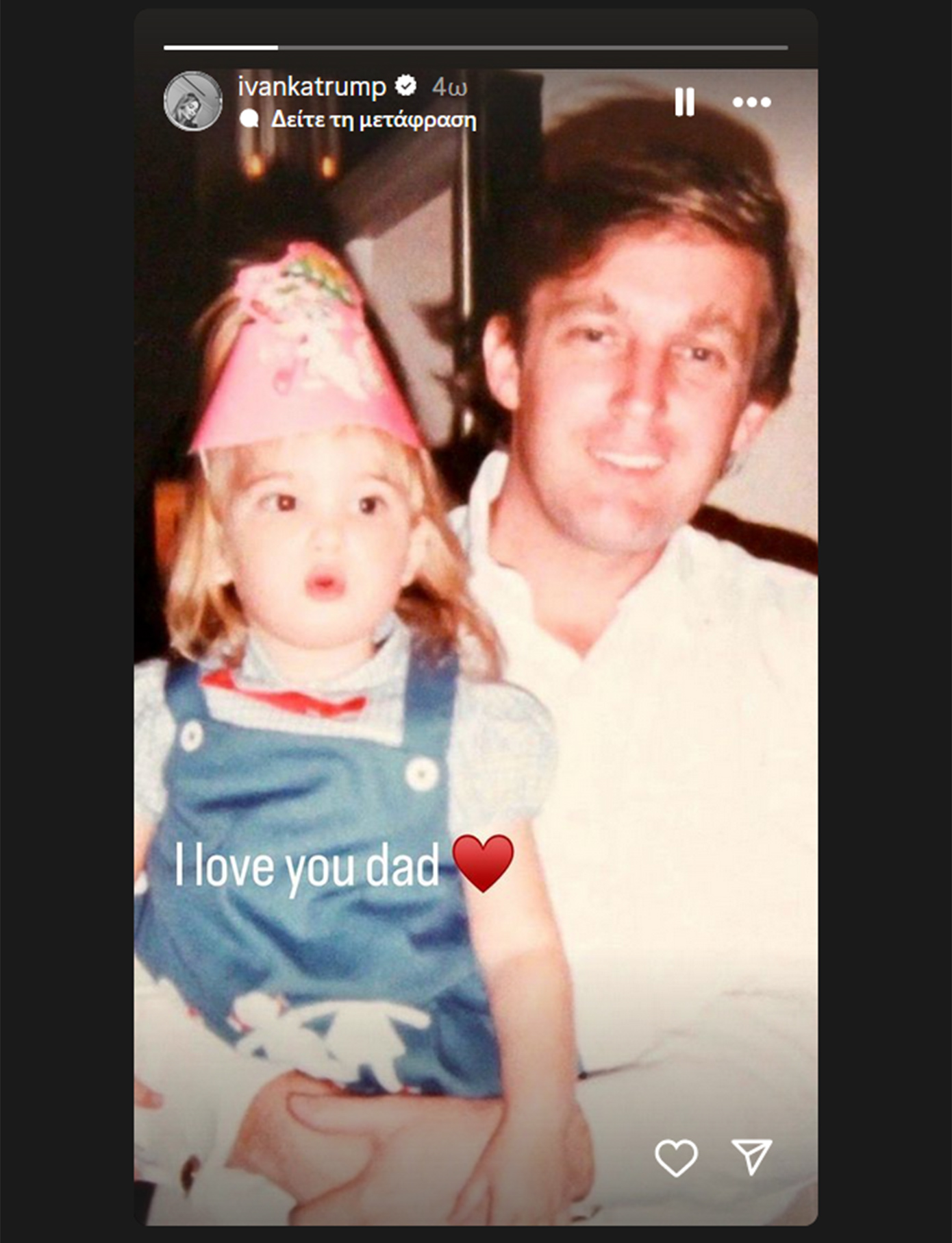 Στη φωτογραφία που δημοσίευσε η Ιβάνκα Τραμπ στα Instagram Stories, ο Ντόναλντ Τραμπ στα νιάτα του έχει αγκαλιά του την κόρη του όταν ήταν μικρό παιδί.