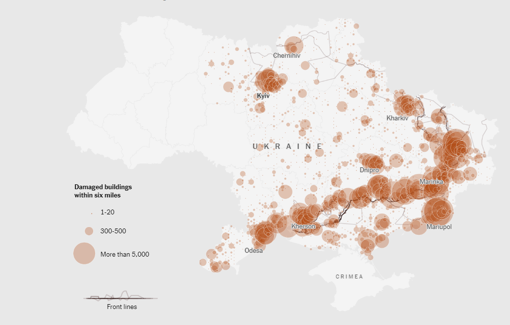 Μαζί με επιστήμονες οι δημοσιογράφοι ανέλυσαν δορυφορικές εικόνες από κάθε κτίριο της χώρας, που έχει υποστεί ζημιές ή έχει καταστραφεί τα τελευταία δύο χρόνια. «Αυτή είναι η πρώτη ολοκληρωμένη εικόνα για το πού διεξήχθη ο πόλεμος στην Ουκρανία και το σύνολο της καταστροφής», γράφει η εφημερίδα.