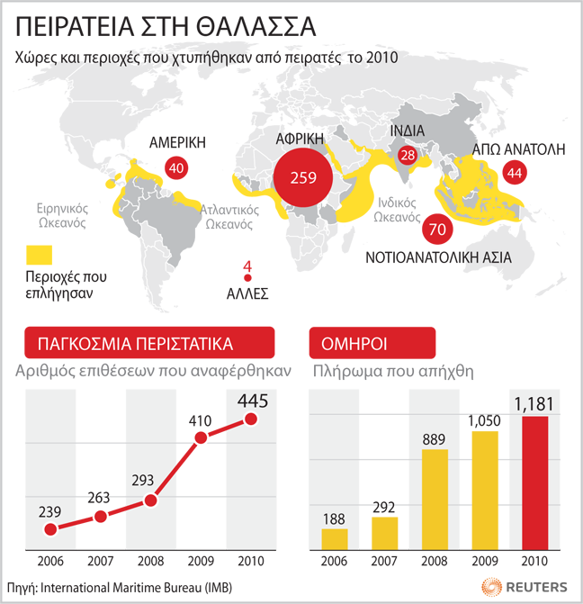 Η θαλάσσια περιοχή στον Κόλπο του Άντεν είναι αυτή κυρίως που πλήττεται από Σομαλούς, ως επί το πλείστον, πειρατές. Πέρσι σημειώθηκαν συνολικά 445 επιθέσεις παγκοσμίως, ενώ απήχθησαν 1.181 άτομα.