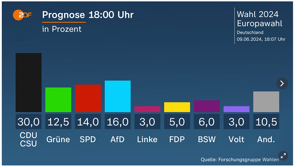 Ο συνασπισμός των Χριστιανοδημοκρατικών (CDU/CSU) φέρεται να κερδίζει την πρώτη θέση στις Ευρωεκλογές, σύμφωνα με τα exit poll στη Γερμανία, με ποσοστό 29,5%. Ακολουθεί το AfD με 16,5%, προσπερνώντας τους Σοσιαλδημοκράτες του SPD (14%), καθώς και τους Πράσινους, οι οποίοι καταποντίζονται, πέφτοντας στο 12%.