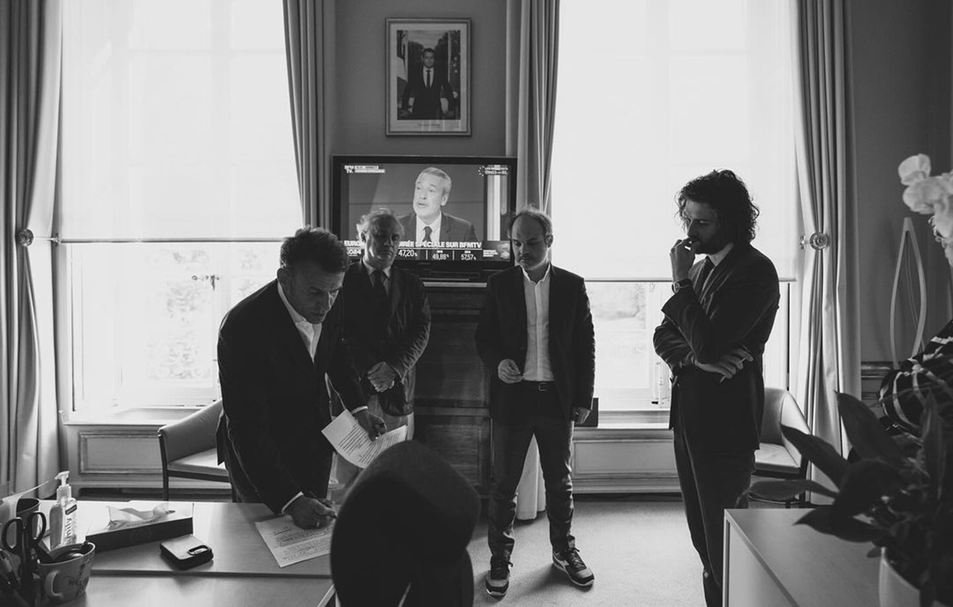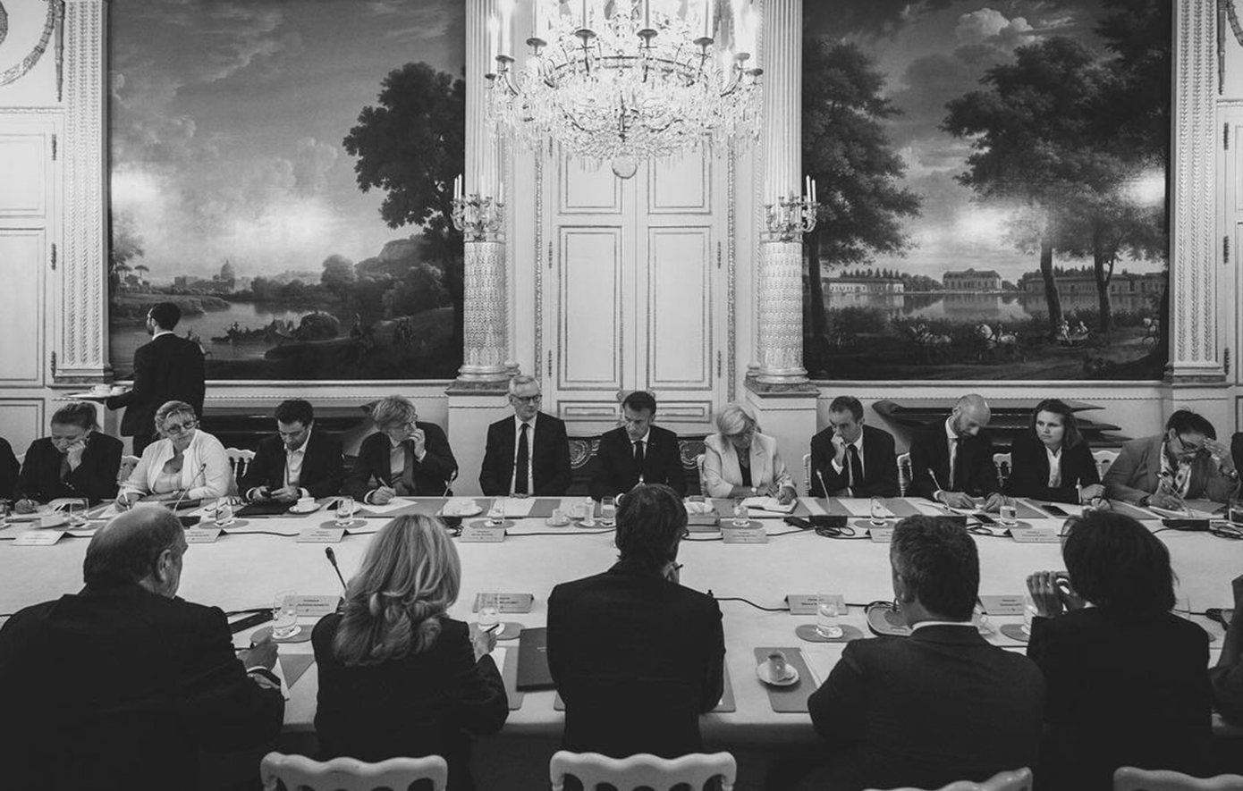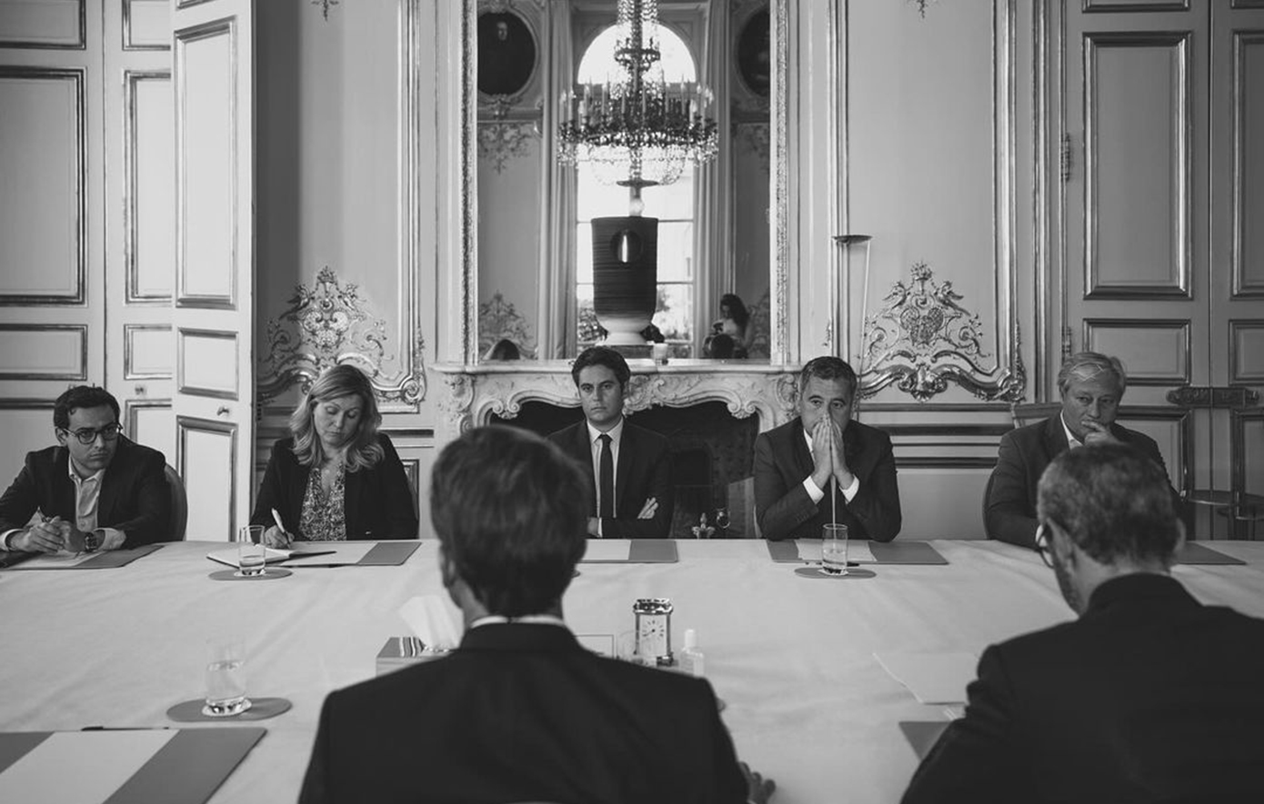 Στο τραπέζι μπροστά του κάθονται, από αριστερά προς τα δεξιά, οι Στεφάν Σεζουρνέ (υπουργός Εξωτερικών), Γιαέλ Μπράουν-Πιβέ (πρόεδρος της Εθνοσυνέλευσης), Γκαμπριέλ Ατάλ (πρωθυπουργός), Ζεράλντ Νταρμανάν (υπουργός Εσωτερικών).